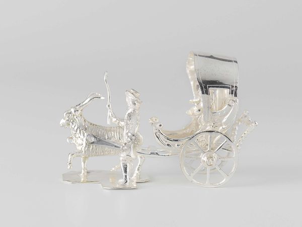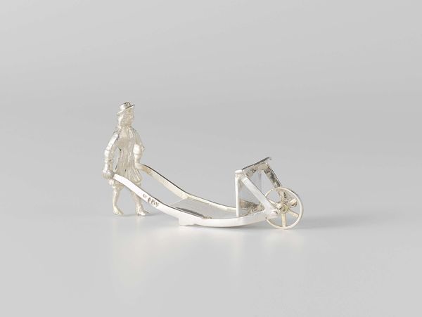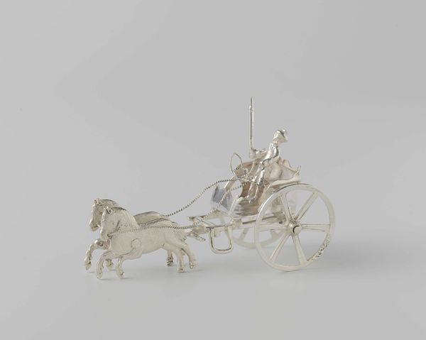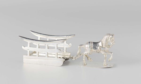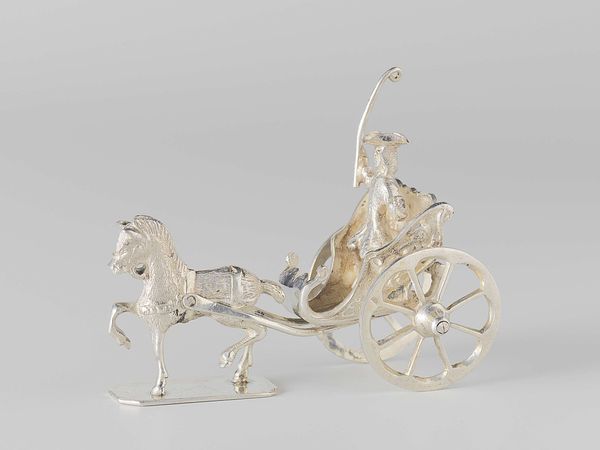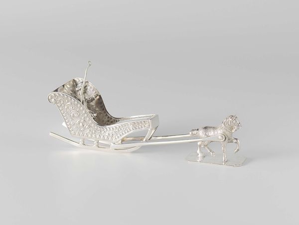 Curator: Oh, this little fellow sparkles! I love the precision of such small figures. Editor: Yes, the work before us is entitled “Arrenslede,” crafted by Arnoldus van Geffen in 1768. Made from silver, this miniature sculpture encapsulates a world of Baroque decorative art in surprising detail. Curator: Baroque, certainly! Just look at the flourish on the sleigh itself. But also, it's quite serious, isn't it? Cold, somehow, despite the festive subject matter. It's like a fleeting glimpse of a story held under glass. What story do you see? Editor: To me, the severity lies in the material itself – silver has always possessed complex associations. Nobility and purity, certainly, but also restraint. A winter journey, rendered in precious metal, speaks of social status more than seasonal joy. Curator: Absolutely! And what’s interesting to me is how it brings into sharp focus the role of transportation itself. Throughout time, depictions of journeys, especially in courtly settings, have carried implications of political or romantic conquest, revealing power dynamics through an act as simple as getting from one place to another. The rider has complete dominion here! Editor: A frozen theater of ambition, perhaps! You also notice that single, solitary rider – not a pair. That shifts my interpretation of the image. It isn't a celebration, perhaps, but a personal reflection, loneliness maybe. A silent drive in their glittering carriage. It gives the piece depth! Curator: Indeed. And such detailed craftsmanship at this scale begs the question – who was this made for? A dollhouse perhaps? A display piece? Each possibility informs its symbolic meaning! Editor: What's amazing is that something so small holds so much potential for interpretation. Even across centuries, it makes us contemplate privilege and solitude with so few elements at play. Curator: Well said. The symbols endure, shifting meaning across the ages to subtly challenge our contemporary view! Editor: Absolutely. A world encapsulated in silver!