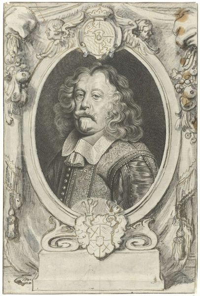 Curator: This engraving from 1672 is titled "Portret van Anthony van Dyck" and is attributed to Albertus Clouwet. It’s a striking example of Baroque portraiture rendered in print. Editor: My first impression is of exquisite detail – a real feast for the eyes! The way light is captured solely through line work, it's captivating. You immediately see this swirling pattern of hatching used to create shading on his face and shoulders. Curator: Exactly. And consider the labour involved in creating such an intricate engraving! Clouwet was part of a network of printmakers, publishers, and artists. This portrait would have circulated widely, disseminating van Dyck's image and, by extension, his artistic status, further reinforcing him as a celebrity artist. The printed image serves as a commodity and piece of historical evidence. Editor: That makes me think about how access to imagery was so carefully controlled in this period. This engraving essentially democratizes Van Dyck's likeness, disseminating it among a public that would likely never have seen the original paintings. But it's a controlled democratization, mediated by Clouwet's skill and the political forces influencing artistic production. Curator: It speaks to the shifting role of the artist in the 17th century and beyond. Van Dyck wasn’t just an artist, he was a brand, carefully cultivated, a phenomenon sustained through these reproductive technologies like engraving, which blurred boundaries of labor, print production and commerce. Notice, for example, the rich textural details, creating tactile representations through cross hatching. This portrait speaks to that shift, presenting him as an elite figure. Editor: And even the surrounding frame feels deliberate, contributing to his heroic image. A kind of calculated visual PR! It brings into question how such portraits helped shape an individual's legacy. Curator: Yes, absolutely. Ultimately, the impact of works like this is undeniable, especially as technologies developed, and reproducibility became more ubiquitous. Editor: Examining this engraving invites us to question our notions of artistic creation, historical legacy, and the power of imagery to shape our perception of those things.