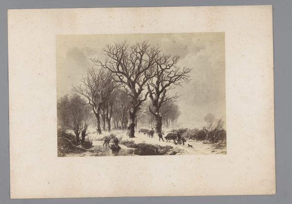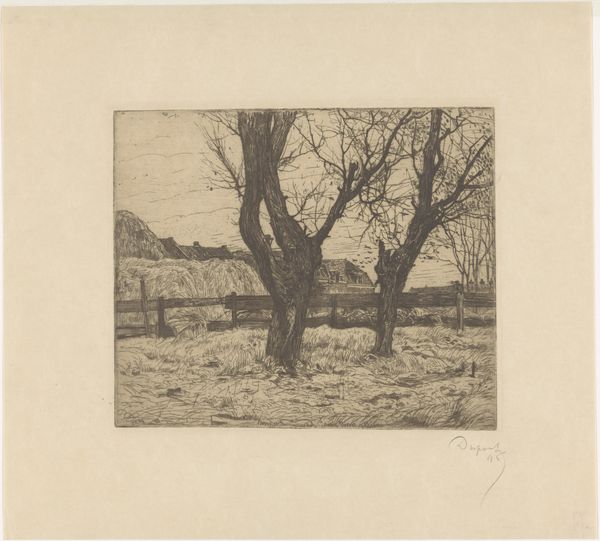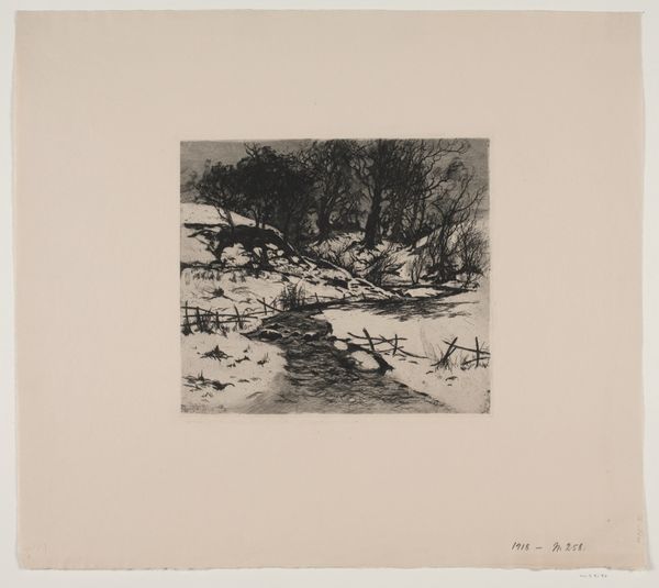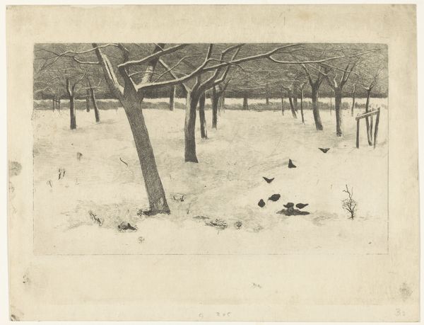 Editor: Here we have "Bøllemosen," an etching by John Lübschitz from 1889. There's something about the starkness of the trees against that pale, possibly frozen, water that gives me a somber feeling. What do you see in this piece? Curator: I see a potent commentary on the fraught relationship between humanity and nature, particularly during a period of intense industrial and social upheaval. The bleakness isn't merely aesthetic. How might the artist be responding to, or even critiquing, the prevailing social conditions through this seemingly simple landscape? Editor: That's an interesting angle. I was just thinking about the scenery, but connecting it to society… So, you’re saying it’s not just a picture of a bog? Curator: Exactly. Consider the title. A "mose," or bog, often evokes ideas of the rural, the marginal, perhaps even resistance to urbanized spaces. This work participates in a discourse about land and ownership and who gets to determine its fate. Does the barrenness of the landscape invite interpretations beyond the purely visual? Editor: It does make me think about the environment, actually. Was there some sort of conservation movement happening back then that this might relate to? Curator: Precisely! As cities expanded, the preservation of nature became increasingly urgent, linked to anxieties about modernity itself. Remember, landscapes are rarely just landscapes. They often mirror our social anxieties and aspirations, particularly class conflict related to land. What new perspectives do you take from this etching, thinking about it through that activist, environmentally-aware lens? Editor: I see the desolation in a new light, almost as a warning. It’s like the artist is saying something about the consequences of neglecting our natural world. Curator: And by examining such an understated work through an intersectional lens, considering class, environment, and history, we unlock its complex social meanings.