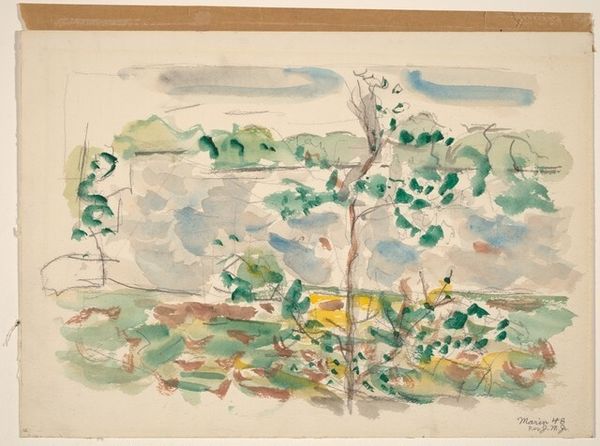 Curator: Up next is Jan Matulka's "Landscape with Footbridge," painted around 1925. What are your initial impressions? Editor: It’s quite dreamlike. The watercolor washes create a soft, almost hazy atmosphere. The colours are muted, yet there’s a strange energy about the distorted, almost cubist forms of these buildings. Curator: Exactly! The painting showcases a fascinating tension. Look closely at how Matulka uses colour to define shapes, moving away from traditional shading techniques. The juxtaposition of these structures almost melts away their form. This approach challenges our conventional notions of perspective and spatial representation. Editor: But I’m also struck by what seems to be the absence of any people within this setting. With these oddly colored and shaped homes and almost monstrous trees it speaks of the sense of alienation so present during that period, immediately following the close of The Great War. Is there some comment on the move away from nature, with the bridge leading to structures that no one occupies? Curator: Interesting. I see more the synthesis of nature and abstraction, influenced perhaps by his European training and the early stages of Modernism. Think about how Matulka, a Czech émigré in America, processes both European modernism and American subject matter into a new visual language. Editor: True, but it's hard not to interpret this cityscape in relation to the interwar climate, as the structures become almost anthropomorphic, alienated yet communal, decaying yet hopeful of repair and return. The entire setting strikes a certain tension about modern progress. It leaves you feeling unsettled. Curator: Perhaps both. Ultimately, it reveals Matulka’s exploration of the poetics of form. A careful construction of planar recession with overlaid watercolour offers, ultimately, something both unsettling and beautiful. Editor: Absolutely. It speaks to the ways art both absorbs and transcends social conditions, offering not just aesthetic experiences, but also critical reflections of its time.