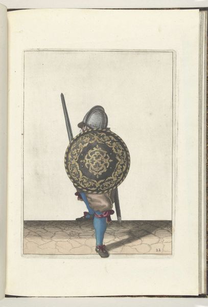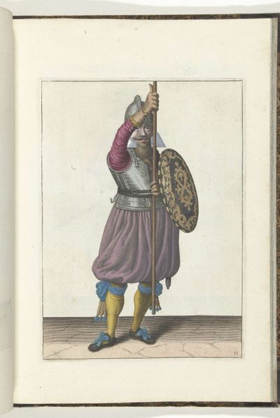 This print, made by Adam van Breen in 1618, presents a soldier in full kit, demonstrating the proper handling of a shield and pike. It is an etching, a printmaking process dating back to the early 16th century. To create an etching, the artist first coats a metal plate, often copper or zinc, with a waxy, acid-resistant substance. Using a needle, the artist scratches an image into the wax, exposing the metal underneath. The plate is then immersed in acid, which bites into the exposed lines. The longer the plate sits in the acid, the deeper and darker the lines will be when printed. The texture and detail achieved through etching lend a sense of immediacy to the image, while the application of color adds to its visual appeal, creating a fascinating blend of traditional craft and fine art sensibilities. The resulting print offers a valuable glimpse into the material culture and military practices of the early 17th century, blurring the boundaries between art, documentation, and social commentary.