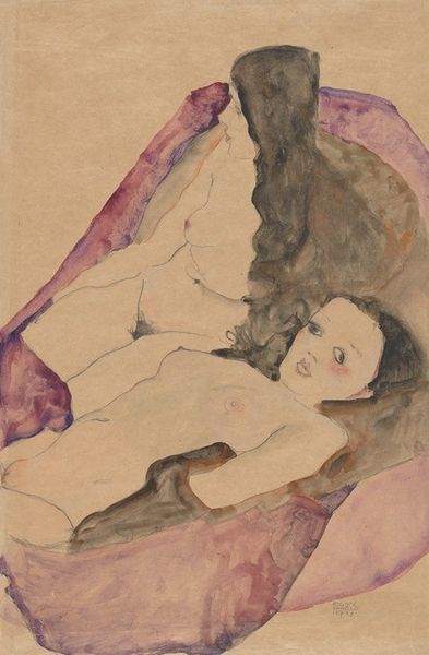 Editor: Okay, next up we have Egon Schiele’s “Black-Haired Girl with Lifted Skirt," made in 1911 using ink and watercolor on paper. It’s quite raw and feels unfinished, and it’s difficult to view without feeling... something. What can you tell me about it? Curator: Looking at Schiele's process, the application of ink and watercolor is deliberately stark, highlighting the fragility of the female body as a commodity within the Viennese art scene. Notice how the figure is presented. Is this raw vulnerability a reflection of societal consumption of the female form, stripped bare, or a means of artistic and commercial defiance? Editor: That's interesting. So you're suggesting that the sketch-like quality and the, frankly, confrontational pose, could be Schiele's commentary on how women were being 'used' in art at the time? Curator: Precisely. Consider the availability of materials like paper and ink versus oil paints. Was this choice purely economical, or does it also reflect a desire to quickly capture fleeting moments, reflecting the transient nature of labor and sexuality in a rapidly changing industrial world? Editor: Hmm. I always just assumed he was being provocative for the sake of it, but framing it within the means of production, as almost a rushed product reflecting social attitudes, really opens it up. Curator: And what about the "craft" elements present: the intimate and explicit portrayal challenges accepted class divisions that existed in visual language at the time, and elevates it as fine art by being thought provoking. The image leaves the viewer wondering how the means and circumstances of its making alter the viewing. Editor: I'll definitely think differently about Schiele and his methods from now on, now I know it has roots deeper than the mere physical! Thank you for your thoughts! Curator: It has been enlightening.