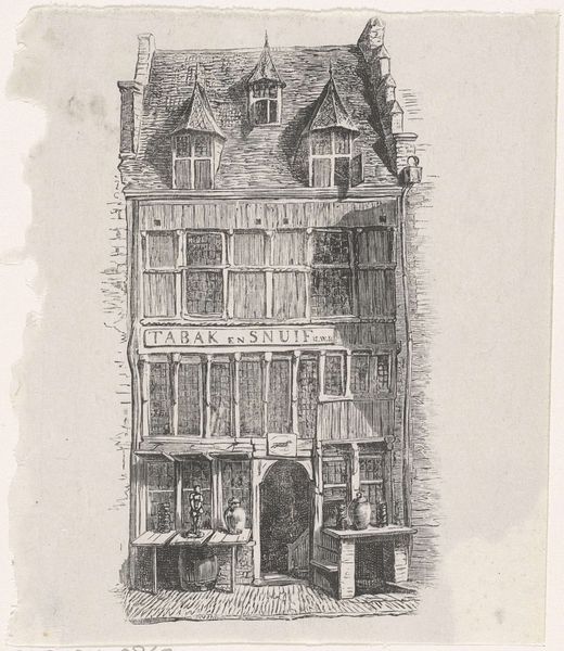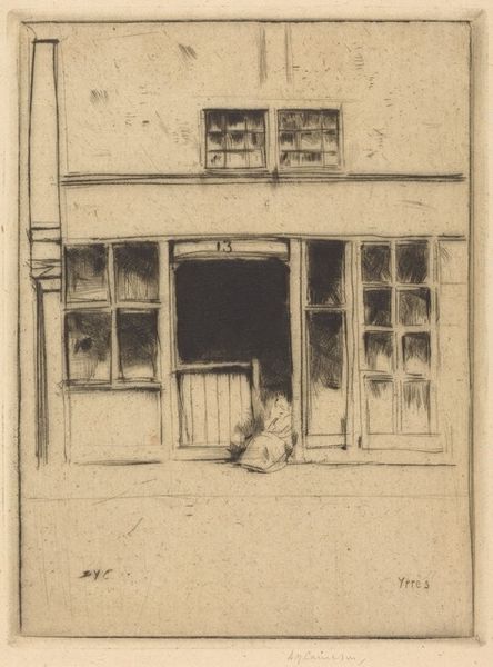 Curator: David Young Cameron's etching, "Elphinstone Tower and Chapel (Glasgow)", created around 1900, offers a study in light and shadow using the print medium. The buildings dominate the scene, almost eclipsing the solitary figure walking by. My first impression is quietude. What is your read of this work? Editor: The architectural mass possesses a certain starkness, doesn't it? The tonal range—how the hatching of the etching renders texture on stone and brick, then dissolves into that inky sky above! Note also the positioning of the buildings relative to each other, creating this rather strong visual diagonal, forcing your eye from the doorway to the shadowed gable. It's a masterful display of composition! Curator: Indeed. I see this as a symbolic tableau, steeped in themes of Glasgow's transformation at the turn of the century. Consider the lone figure juxtaposed with the age-old tower and chapel. There's a strong connection between the spiritual and the individual’s place in an urbanizing world. Do you discern similar cultural readings here? Editor: Absolutely. And the use of etching supports that symbolic quality. The incised lines create not just detail but a distinct mood, don’t they? A certain heaviness in those lines hints at the weight of history itself—a physical history etched onto the plate and transferred to the page. Look closer, for instance, at the gothic window. What images or ideas does this choice convey? Curator: Certainly, gothic windows were used as ‘memoriae’, that served the function of memory-place to house historical memories. And in the context of the Glasgow School movement, where artists were questioning their connections to Scottish and European traditions, Cameron creates a very poignant scene. This location embodies cultural resilience. Editor: Beautifully stated. What began as an intimate analysis has yielded insights far beyond mere visual appreciation. One finds, upon this closer looking, more meaningful interpretation of its symbolic dimensions! Curator: A powerful reminder that artistic merit resides not just in skillful execution but the ability to subtly reflect culture and shared human experience.