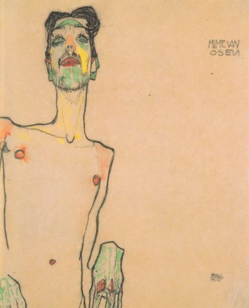 Egon Schiele created this nude portrait of Erwin Dominilk Osen using watercolor and pencil. The figure is placed against a muted background that focuses our attention on the subject's stark presence. The subject's upward gaze, coupled with the elongated neck and somewhat theatrical hand gesture, creates a sense of dramatic tension. Schiele's use of line is particularly striking, with sharp, angular contours defining the figure's form. Color is applied sparingly, yet purposefully, heightening the psychological depth of the portrait. The vivid reds around the eyes and on the hands draw the viewer's gaze, creating a sense of unease and vulnerability. Schiele was an important figure of the Expressionist movement. His work often grapples with themes of sexuality, death, and the human psyche, and his portraits frequently depict subjects in states of emotional distress. Schiele rejects traditional conventions of beauty and decorum. Instead, he fearlessly explores the darker aspects of human experience, creating artworks that are both unsettling and deeply affecting.