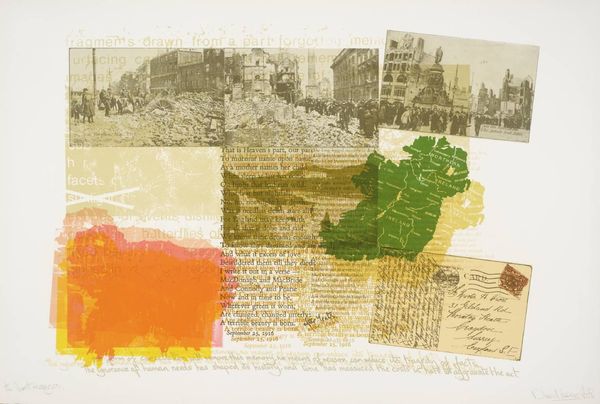 Editor: Larry Rivers' "[cover]" presents a scrapbook-like depiction of Boston. The collage effect, with seemingly disparate images, feels almost like a commentary on fragmented memory and history. How do you interpret this work, especially considering the cultural context? Curator: Rivers, through his use of collage, directly engages with the layered and often contradictory narratives surrounding American history. Note the juxtaposition of the "BOSTON" title with images of colonial life and the almost haphazard arrangement. Do you think Rivers is making a statement about how we consume and understand our past? Editor: I think so. The messiness suggests a critique of idealized historical narratives, almost like peeling back the layers of a city's constructed image. Curator: Exactly. Rivers' piece challenges the viewer to question whose stories are being told and how those stories are presented by cultural institutions. A potent statement, wouldn't you agree?