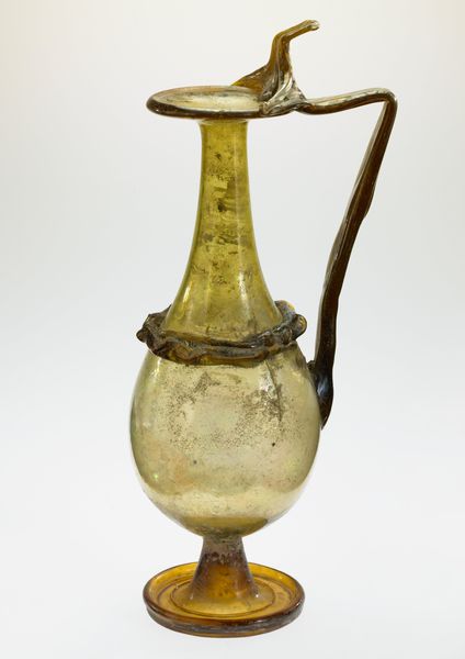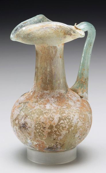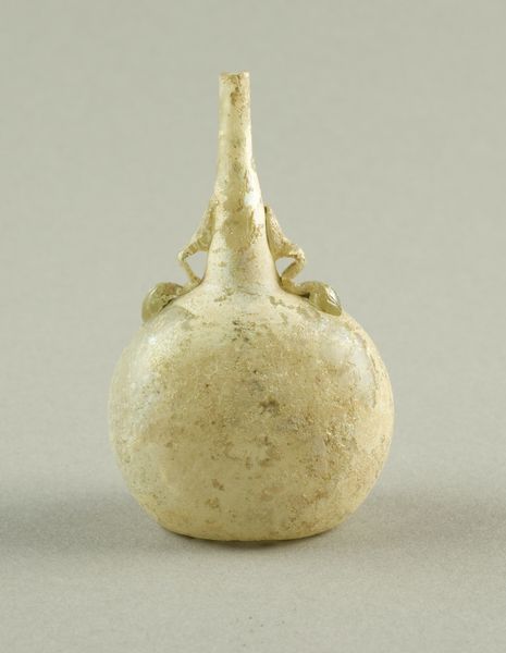 Editor: Here we have an exquisite glass Flask, probably from the 9th to 11th century. I'm really drawn to how the iridescent surface seems to shimmer. What do you find most interesting about this object? Curator: Well, immediately I'm interested in how this object collapses boundaries. Its clear utility contrasts the almost baroque additions of decoration around the main body. The material tells a story too; the availability of such refined glass signals complex trade routes and specialist craftsmanship of the time. Editor: The handles – are those functional or purely decorative? They seem almost awkwardly placed. Curator: Precisely! Do they aid in handling, or do they indicate something more? Perhaps status, or a connection to a particular workshop that valued ornate designs? Remember, every choice – material, form, decoration – represents labor, skill, and the intended consumption of this piece. It's function transcends mere containment; it becomes a display of production and the aspirations of its owner. Editor: So, you’re saying we can read this flask as an artifact not just of beauty, but also of social and economic practices? Curator: Exactly. How and where the glass was sourced, the techniques employed in its manufacture, and ultimately who would have used such a thing speaks volumes about the social landscape of its time. It allows us to consider labor, trade and the very concept of value in the medieval world. Editor: I’ve never thought about art this way before, thank you! Curator: Indeed. Considering these details gives us a glimpse into the past, viewed through its means of production and material existence.