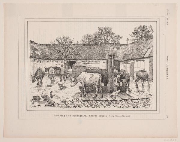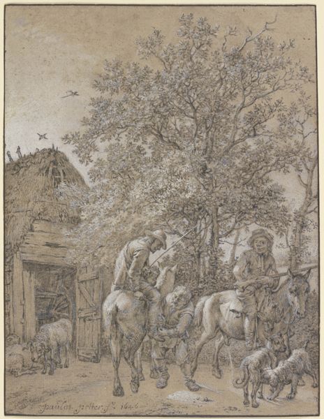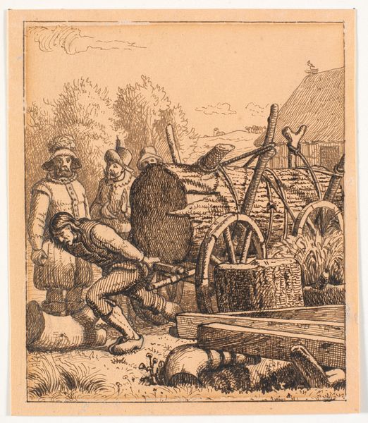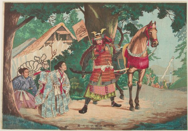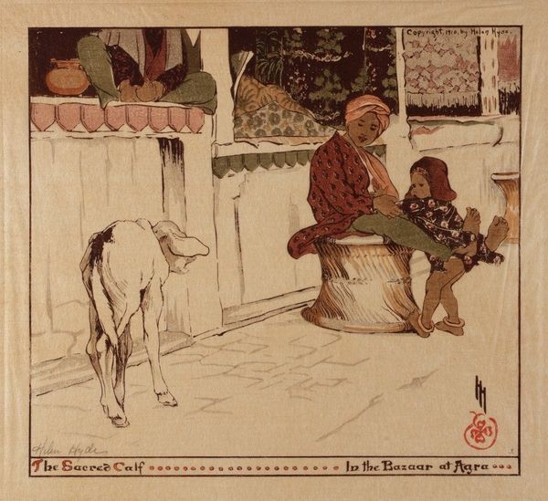Curator: Today we're looking at an illustration by Ivan Bilibin, specifically, his work for the Russian fairy tale "Feather of Finist Falcon." It’s executed in tempera, with great detail given to both the characters and the landscape. Editor: My initial impression is one of nostalgia; it’s almost as if the entire scene is encased in amber. There's something profoundly gentle in the composition, even a bit melancholy, as though the scene remembers a past era. Curator: I agree that the effect is striking. Considering its historical context, the artwork operates within a revivalist trend seeking to reinforce and indeed invent an authentically Russian national identity around the turn of the century. You see Bilibin pulling from folk art traditions but giving it an intensely mannered refinement, indicative of Russian Art Nouveau. This fairy tale theme is an excellent vector for conveying core cultural values, but also implicitly reinforces gendered roles. Editor: Precisely! And look closely at the craft. The lines defining the architecture of the wooden house, the horse’s harness, even the decorative borders framing the scene: the very execution embodies values like labor, patience, skill! It invites us to question, however, whose labor? Who had the means of production? And for what audience? Was it truly representative of Russian peasants’ lives, or an idealized image intended for bourgeois consumption? Curator: Indeed. Also, think about how the narrative embedded within the piece further reflects the cultural politics of its time. We’re offered a romantic lens into the power structures of traditional Russian society, which inherently impacts how female characters such as these are perceived and presented. Editor: Ultimately, Bilibin's work offers a fascinating study of material expression. The narrative of craftsmanship itself intertwines with the representation of peasant life. It reminds us that images like these, especially from this era, can carry complex ideologies related to craft, national identity, and even class relations. Curator: Absolutely, considering its role in crafting national narratives. We might walk away reflecting on how these traditional tales persist in shaping contemporary perceptions of Russian history and identity.