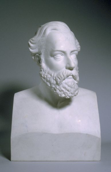 Curator: Immediately, I sense a stoic sort of presence radiating from this bronze bust. Is that verdigris, I wonder? Editor: It is indeed. This is a bronze sculpture titled "Maleren Wilhelm Marstrand" by H.W. Bissen, created in 1858. It resides in the SMK - Statens Museum for Kunst. Tell me, what visual cues contribute to your sense of that stoic presence? Curator: Well, first the figure’s direct gaze, conveying unwavering focus. And those deeply carved lines etched around the eyes and mouth – those are the indelible marks of experience etched in the flesh. This realism is meant to convey the weight of life, don't you think? Editor: Absolutely. Realism as a style was growing rapidly in Europe as society became increasingly democratized and moved past Romantic glorification of heroes. I also see a hint of classical sculpture, in the way that the bust abruptly ends at the chest and arms. Though the lines aren’t nearly as idealized as something from ancient Greece. What could those styles signify? Curator: Well, if Bissen was deliberate about it, which he surely was, one could argue it implies a conscious effort to present Marstrand as a modern intellectual with ties to this ancient classical tradition that represented wisdom. His gaze directs him toward the future, informed by historical consciousness. It echoes ideas about how individuals reflect deeper universal principles, a hallmark of portraiture since antiquity. Editor: I appreciate your insight into this continuity. I find myself wondering about the significance of commemorating Marstrand at that specific point in history, Denmark in 1858? What were the social and cultural conversations occurring at the time? How would the people receiving it respond to its statements on wisdom and vision? Curator: You bring up an important point about historical context. To understand this portrait fully, we'd need to explore the society for whom Bissen created this artwork. Editor: Indeed, how artistic vision functions within systems of power. It all raises such crucial and necessary questions! It gives me hope when thinking about how we view artworks today. Curator: It certainly emphasizes the importance of sustained questioning when engaging with visual culture.