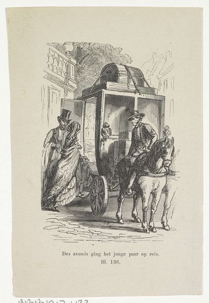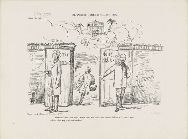 Curator: Here we have a lithograph from 1865 titled, "Spotprent naar aanleiding van Nadars ballonvaart te Amsterdam," which translates to "Cartoon related to Nadar's balloon flight in Amsterdam." It's by Johan Michaël Schmidt Crans. Editor: My first impression is organized chaos! The tightly rendered lines capture so much frantic energy. Look at all those figures scurrying around. The textures feel so tangible for a print, all rough paper and etched detail. Curator: The balloon itself is a strong symbol, referencing Nadar's pioneering spirit and fascination with photography from above. Note the smaller balloons; I see them as an extension of Nadar's impact on that time, like scattered seeds. Editor: Exactly, and consider the materials – lithography allowed for mass production and dissemination. So, while Nadar explored aerial perspective, this print brought that conversation directly into homes and public spaces through readily available imagery. Who were they meant to reach? Curator: The text in the speech bubbles and on the placards that some characters are holding provides an intriguing narrative layer, perhaps satirical commentary on Dutch politics and religious institutions. One character, for example, carries a sign labeled "Godsdienstlovic School" – a school focused on religious doctrines. The composition becomes a field for competing ideological claims and systems. Editor: You can see it right here in the division of labor and social status represented. One individual appears to oversee, while others are actively engaged in physically hauling around items inscribed with “KABINET.” Are we seeing different levels of societal access depicted through the literal burden each figure carries? What can that distribution tell us about the artist's viewpoint? Curator: These caricatures of specific public figures transform the individuals into instantly recognizable cultural icons of that particular moment in time. As such they take on further weight as commentaries on societal dynamics and its legacy in cultural memory. Editor: Considering the printmaking process, it's clear the artist made choices to emphasize these figures’ roles through the manipulation of line and shading, so this would further engage an audience used to identifying class, labor and production this way. Curator: Looking closely, you also detect themes of power and ambition, played out within the quickly shifting social landscape as illustrated here. It really encapsulates the turbulence and progress of that period. Editor: For me, it speaks to how printmaking made complex ideas material and accessible during a pivotal point in European history. A great reminder that our current media environment shares so much lineage to these humble forms of image production and labor.