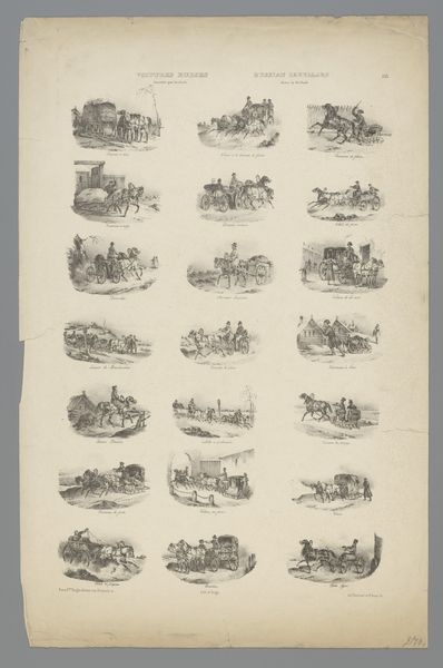 Curator: This detailed print from 1873, titled "Voertuigen," showcases a range of horse-drawn vehicles. Attributed to De Ruyter & Meijer, it’s rendered in ink and functions as both drawing and graphic art, really capturing a moment in transportation history. Editor: Whoa, talk about a catalog of quaint contraptions! My first thought is how incredibly delicate and precise the line work is. Each little vehicle looks ready to roll right off the page! Curator: Absolutely. Think about the broader context: the industrial revolution was changing landscapes. The need to classify and visually document older modes of transport felt almost urgent then. The print displays various types from "Vrachtkar" or Freight cart to "Waterkar," used to transport water. Editor: There’s something charmingly antiquated about it. Like stepping into a whimsical storyboard, where horse-power actually meant horsepower! And those tiny, busy cityscapes nestled around some of the vehicles—such a contrast! It makes me wonder how smooth – or not – a ride these vehicles had on cobblestone streets! Curator: That contrast emphasizes social strata too. Look at the "Vigilante", with its enclosed carriage, signaling status in contrast to the open "Russian sledge ride" depicting what we may suppose were working-class experiences. It really captures the way class operated through daily rituals and available infrastructure. Editor: Makes you think about accessibility and equity... some vehicles shielded passengers from the elements while others, well, exposed them completely! There is a hierarchy sketched in the open. Curator: Indeed. Transportation access is integral to economic mobility, political freedom, and even identity formation. Editor: These are more than just vehicles, then! These wheeled vignettes provide unique and subtle observations regarding the ways that societal forces act in our daily lives! So, what you see when you begin at a simple cart then morphs and speaks far beyond mere transport… Curator: Precisely. De Ruyter & Meijer inadvertently gives us a window into not just transportation, but societal organization too. A reminder how technology and infrastructure have always intertwined with our complex social tapestry.