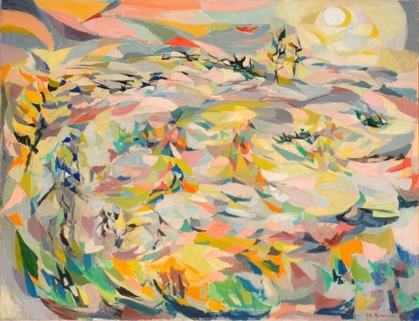 Editor: Today we're looking at Charles Burchfield's "Wind Blown Asters," a watercolor painting from 1951. I find the stylized representation of nature really striking; it's like he's not just depicting a landscape, but also conveying a feeling, a certain energy. How do you interpret this work? Curator: Burchfield's intense connection to the natural world definitely comes through. He saw nature as a conduit for spiritual and emotional experience. Paintings like these were made as Modernism sought out nature as a realm of experience unavailable in our modern world. He wasn't simply depicting the literal appearance of wind-blown asters; he was imbuing them with a symbolic power. How does that make you feel, looking at it that way? Editor: It definitely makes me think about how we project our feelings onto nature, using it as a mirror. The plants almost seem alive, maybe even sentient. Curator: Precisely! And think about the context of 1951. Post-war America, a time of burgeoning industrialization and a growing disconnect from rural life for many. Burchfield's work can be seen as a yearning for a more primal connection, a reaction against the increasingly mechanized world. Museums also began displaying works celebrating nature to soothe the social impact of new disruptive technologies. Do you feel any sense of unease mixed with beauty in the work? Editor: Yes, especially with the stormy sky and those almost eerie 'eyes' amongst the flowers. It's not a purely romantic view of nature, is it? Curator: Not at all. It acknowledges nature's power, its potential for disruption and even danger. This wasn’t merely aesthetic. Artists are signaling something significant and often overlooked or pushed to the margins. But without the socio-political background and institutionalization we miss these valuable connections and commentaries. Editor: This painting becomes a fascinating commentary on society and our relationship with the environment, I hadn't considered the cultural context. Thanks for your insights! Curator: It's crucial to consider not only the image but its place in history; art becomes a lens through which to view and understand ourselves.