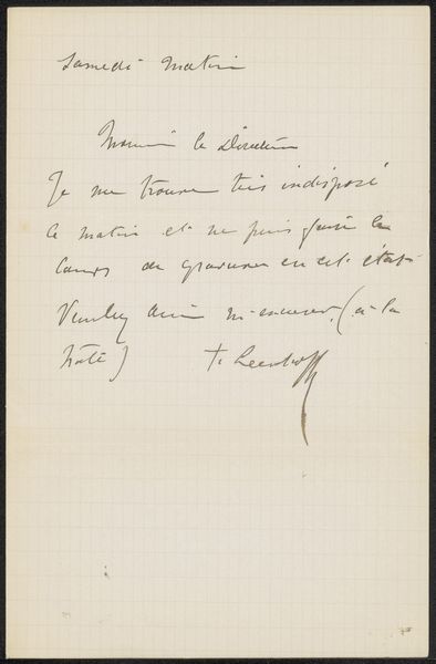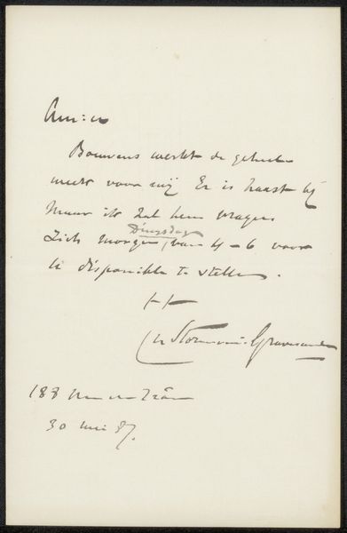 Editor: We're looking at Ferdinand Leenhoff's "Brief aan August Allebé," created sometime between 1851 and 1914 using pen and ink. It appears to be a handwritten letter. The looping script and the formality of the language create a very... proper and precise impression. What do you see in this piece, beyond just the text itself? Curator: Ah, yes, text as art. It always gets me pondering. You know, before the age of the typewriter, handwriting *was* an art form, reflecting personality and social standing. Look at the confident flow, the almost performative flourishes! It hints at the writer's persona, doesn't it? Almost like a calligraphic self-portrait. Do you feel a certain rhythm or emotion radiating from those strokes? Editor: I do notice a sense of flow and flourish. Almost like the words are dancing! I didn't think about the status that handwriting might communicate. Curator: Precisely! Leenhoff’s penmanship exudes a certain refinement, doesn’t it? Almost like an unspoken declaration. Consider also the context: Who was Allebé, the recipient? A teacher at the academy, the letter states. How would this affect Leenhoff’s composition, the formality, the request? Think of the power dynamic in that moment! The humble applicant versus the lofty professor. Editor: That completely reframes it! It’s not just a letter; it's a carefully crafted performance. So interesting how something so commonplace can be such a complex expression. Curator: Exactly. Every curve, every slant whispers a little something. And that, my friend, is the delicious magic of art. Thanks for helping me view this in new ways, as well. I appreciate it.