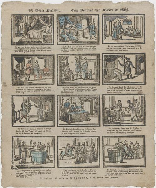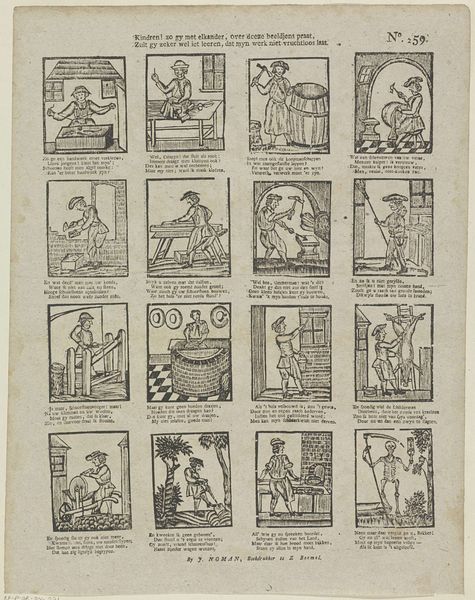 Editor: We're looking at "Beroepen en ambachten," or "Professions and Trades," an etching by Alexander Cranendoncq, created sometime between 1822 and 1849. It's a print, showing a grid of little scenes, each depicting a different occupation. It has an almost cartoonish and folksy mood. What stands out to you in terms of composition and form? Curator: The visual construction relies heavily on a clear separation of form and ground. Observe the distinct rectangles, each acting as a proscenium stage, framing these activities. The linear quality of the etching, a network of strokes forming both shape and shading, generates a unique spatial dimension. Each frame becomes a study in figure-ground relationships, influencing how we perceive individual stories and their collective presentation. It begs the question, how do these choices impact the reading of the narrative? Editor: So, by isolating each scene, are we encouraged to see each profession as an individual contribution to society, almost like a series of independent studies of work? Curator: Precisely. Consider the function of line within each frame. It is not merely descriptive; rather, it structures space, defines volume, and signifies texture. Note, too, the minimal cross-hatching used to model form and the stark contrast it creates, thereby calling attention to its inherent artifice. How might you interpret this stylistic decision, devoid of the embellishments of academic realism? Editor: It creates a simple, clear message: 'This is what they do’. I can also imagine this piece of graphic art might have been used as a teaching aid. What did you learn? Curator: I learned that breaking it down into its component parts and considering the relationship of the part to the whole is what stood out to me the most.