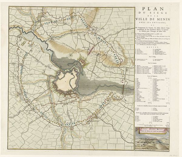 Curator: I'm immediately drawn to the ordered chaos of it all, you know? All these lines and blocks, standing in for something truly brutal. Editor: Indeed. Here we have an engraving dating from between 1834 and 1856 by T.Z. Keikes, a "Plan van de slag bij Waterloo, 1815," housed right here at the Rijksmuseum. What’s particularly compelling here is its formal nature—it renders an immense historical event into the precise language of cartography. Curator: Cartography, right. But it’s more than a map, isn't it? The pastel palette somehow softens the image. Yet I keep imagining the screams, the smoke, the… Well, the utter disaster of war made neat and tidy. Editor: Precisely. The ordered lines belie the profound disorder and human cost of the event itself. The work highlights the tendency to sanitize history through formal representations, turning something immediate and corporeal into abstract blocks on a field. The choice to display battle as landscape almost neutralizes the image, wouldn’t you say? Curator: Perhaps… but doesn't every representation, even the most visceral, create distance? This one just embraces that distance openly. Look at how delicately the artist captured each of those tiny forests that became silent witnesses of what happened in this field... In its own way, it's trying to digest and present some meaning to an unfathomable event. Editor: Well, the print circulated in an era grappling with the aftermath of revolution and empire. The public dissemination of imagery was often used to reconstruct narratives around battles that changed the political landscape, no pun intended, so I see this print more as a piece of historical rhetoric, designed to elicit particular feeling. Curator: Perhaps... Anyway, looking at it like this is giving me the chills, I will head somewhere else now. Editor: It does invite contemplation on the role of art in framing our understanding of historical conflicts. Something to consider as we continue our visit today.