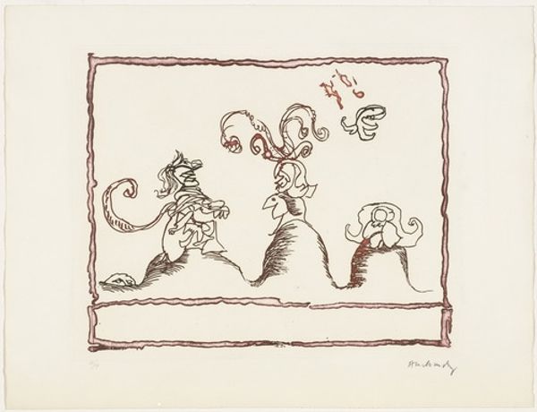 Curator: Here we have an untitled work from Pierre Alechinsky’s 1966 series, "The Test of the Title." It's a mixed-media drawing, predominantly ink, with an interesting use of splattering techniques. What are your first thoughts? Editor: It feels spontaneous, almost frantic. The dark lines and sporadic splashes evoke a sense of playful chaos, a glimpse into the artist's subconscious perhaps. Curator: Alechinsky was associated with Art Informel, which really emphasized process and the artist’s gesture. Notice the raw quality of the lines; they suggest a quick, almost automatic way of working. Also, look at the border – it looks deliberately ragged. It emphasizes that this is, materially, an exploration. Editor: The imagery is fascinating – a blend of biomorphic shapes and distorted figures. Are those birds, or perhaps whimsical spirits? I'm intrigued by the way these forms seem to dance and interact within the confines of that border. Curator: He’s really pushing at the conventions of the medium, isn't he? Think of it – he's taking ink, typically a medium for controlled lines and detail, and forcing it into something so raw, so immediate. This almost rejects the slick production we often associate with high art. He highlights the labor involved. Editor: Absolutely, and these figures seem pulled from some ancient bestiary or a long-forgotten folk tale. Those birdlike creatures evoke freedom and flight. There is even what looks like a ritual scene on the right, all crammed into a single moment. This compression suggests urgency. Curator: Urgency, or maybe an openness to chance. Alechinsky would have allowed the ink to dictate some of the form, embracing accident. What are the ways of thinking involved? And, crucially, how can such techniques be adopted? The material really comes first. Editor: Yes, but what a vocabulary he's building through these figures and motifs. He is creating a dreamlike realm packed with emotional resonance and cultural references – hidden yet discernible to the viewer. The eye never rests; you keep finding new connections and contrasts within the chaos. Curator: For me, it's about demystifying art production. We see the artist experimenting, playing with the properties of ink and challenging what constitutes a ‘finished’ work. Editor: I agree. For me, this artwork speaks to the enduring power of visual symbols and the narratives they carry through time. The piece uses these abstracted figures as archetypes of feeling and ideas. Curator: I suppose we both agree it makes you look! Editor: Indeed! Thank you for bringing such detail to our understanding.