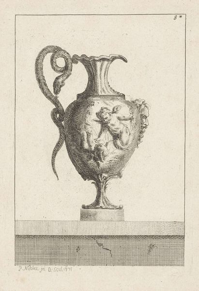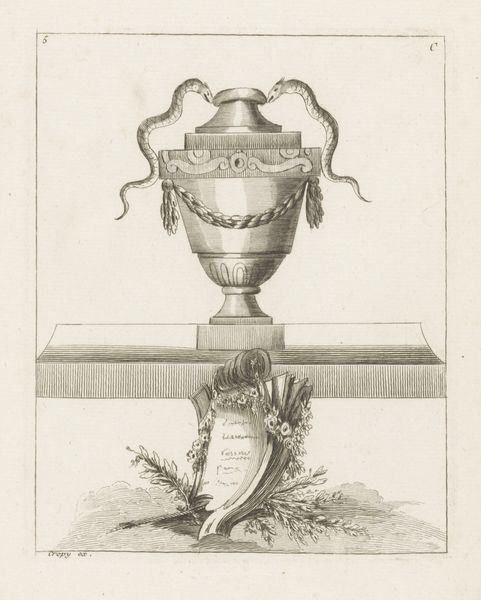 This undated print from an unknown artist depicts a vase with garlands and was likely made to illustrate a book. In eighteenth-century France, the decorative arts experienced a surge in popularity, in part due to the influence of the French court and aristocracy. Vases, like the one depicted here, became sought-after objects, symbols of refined taste and social status. This image probably advertises a pattern book containing new designs for vases. By the 1700s these books were driving trends in the decorative arts. It suggests a growing interest in accessible design ideas for a wider audience. The print points to an interesting interplay between art, commerce, and social aspiration during this period. The historian's role involves delving into archives, design books, and social histories to uncover the context that shaped this artwork and its place in cultural history.