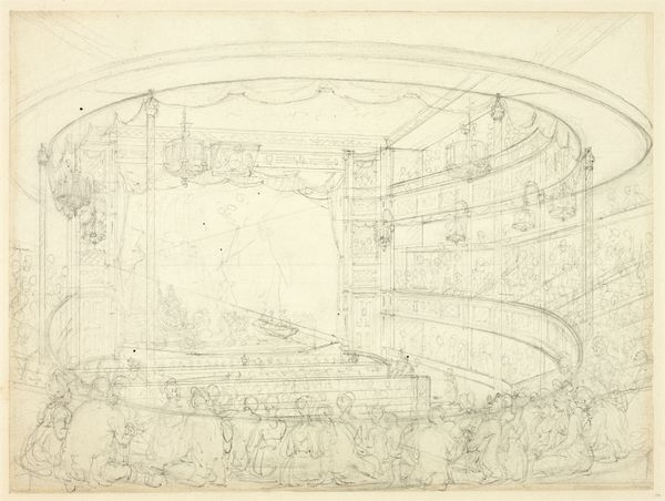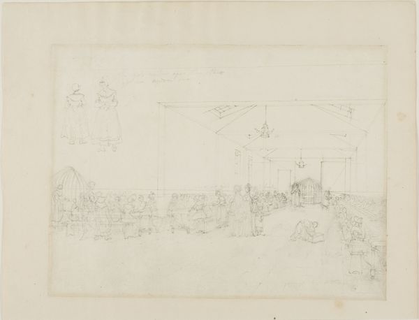 Augustus Charles Pugin's "Study for Lloyd's Subscription Room, from Microcosm of London" presents a delicate pencil sketch of a bustling interior. The composition, built on receding lines and subtle gradations, evokes a sense of depth and architectural grandeur. Pugin masterfully employs line to articulate the room's structure. The geometric precision of the ceiling's coffers contrasts with the looser rendering of the figures below, creating a dynamic interplay between order and activity. This mirrors the broader intellectual currents of the time, where Enlightenment ideals of reason and order were increasingly confronted by the dynamism of modern life. The drawing functions as more than just a preparatory sketch. It represents a microcosm of society, capturing the spirit of commerce and social interaction within the framework of classical architectural principles. It is a dialogue between form and function, order and chaos, inviting us to consider how these elements coexist within the urban experience.