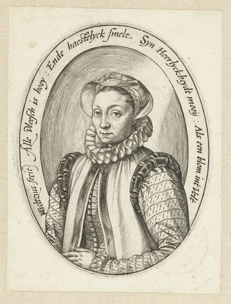 Curator: Editor: This is an engraving of Maria, Queen of Bohemia, made by Jacob Hoefnagel sometime between 1575 and 1603. It has such a formal, almost stiff feel to it. What are your first thoughts when you see this? Curator: The texture achieved through the engraving process itself really stands out. Notice how Hoefnagel uses the density and direction of the lines to define not just the form, but the quality of the materials depicted: the crisp ruffles, the heavier fabric of the gown. The labor involved is quite apparent. Considering the social standing of the subject, how does the choice of printmaking – a relatively accessible medium even then – impact the work's meaning for you? Editor: That's interesting, I hadn't thought about the engraving as a choice about accessibility. Does the printmaking democratize the image, even of royalty? Curator: Exactly. The act of reproducing it, the labour of each print, allows for a wider circulation, taking the image, and therefore the idea of Maria, beyond the confines of the court. It links artistic skill, mechanical reproduction, and the construction of a royal persona in a really compelling way, don't you think? Who, exactly, was this made for? Editor: So it's less about simply representing Maria, and more about constructing and distributing a particular image of power through a specific material process? Curator: Precisely. It is about manufacturing authority. This makes me appreciate the role that reproductive technologies played in the shaping of early modern European identities all the more! Editor: I'm definitely looking at this engraving in a new light. It's about more than just appearances!