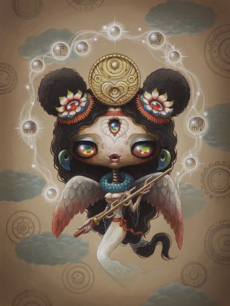Editor: Here we have "Macrocosm," a mixed-media piece by Yoko d'Holbachie. I’m really drawn in by the dreamlike quality, and the blending of a delicate, almost doll-like figure with all these intricate, mechanical details surrounding it. What's your interpretation? Curator: It's fascinating how d’Holbachie juxtaposes the ethereal with the mechanical. The seemingly innocent, childlike figure is encased in a sort of industrial, ornamental framework, which can be seen as a reflection on how society, particularly institutions, can influence or even constrain the individual. Editor: So, the background isn’t just decorative, it's commenting on how societal structures box people in? Curator: Exactly! And consider the term "Macrocosm" itself. It means ‘the great world; the universe’. Doesn't it seem like the artist may be making a commentary on power dynamics and how one’s small actions might influence greater things? Editor: Yes, the title gives another angle to consider the bigger picture and the connection between us and something larger. Even how we consume art. Curator: Precisely! The work highlights how cultural expectations and the market itself shape an artist’s, and subsequently the audience's, perspective. Where do you see the figure fitting into current themes of art? Editor: Perhaps the way it reimagines folklore creatures through this pop-surreal lens… or that she may even symbolize humanity in a futuristic or dystopian society? Curator: An astute observation. D'Holbachie has indeed made the viewer question, from a historical perspective, whether our role in society dictates personal interpretation, or the inverse. It's all up to the individual to decide and the artwork encourages one to contemplate such notions. Editor: This makes me look at the piece in a completely new way; what started out as something "pretty" suddenly has layers of social and cultural meaning attached to it. Curator: Indeed. By looking through a historical and socio-political lens, we can see how art constantly reflects and questions the systems around us. It’s something to think about when experiencing any artwork, isn't it?
