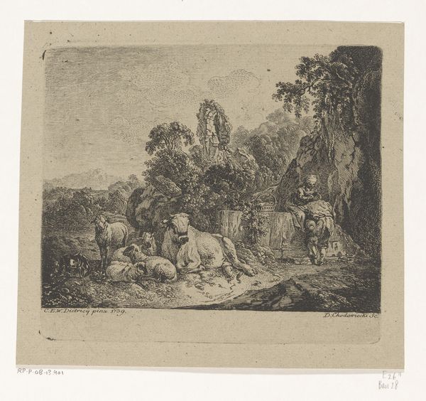 This etching, made by Balthasar Anton Dunker, depicts a woman with a bagpipe and a dancing child, surrounded by sheep and a dog. The image evokes a romanticized vision of rural life, a theme that gained popularity in Europe during the 18th century. Dunker was working in Switzerland during the late 1700s, a period marked by significant social and political change. Enlightenment ideas about the value of the individual and the importance of nature were gaining traction, challenging traditional aristocratic values. The image reflects a growing interest in the lives of ordinary people. By depicting a humble scene of music and dance, Dunker subtly questions the rigid social hierarchies of his time. The presence of classical ruins in the lower-left of the image add to the political message, connoting the end of the Roman Republic and the rise of Imperialism. As art historians, it's our job to uncover these hidden layers of meaning, drawing on sources from the period to understand the artwork's place within its specific cultural and institutional context.