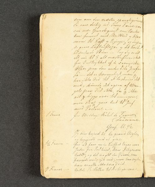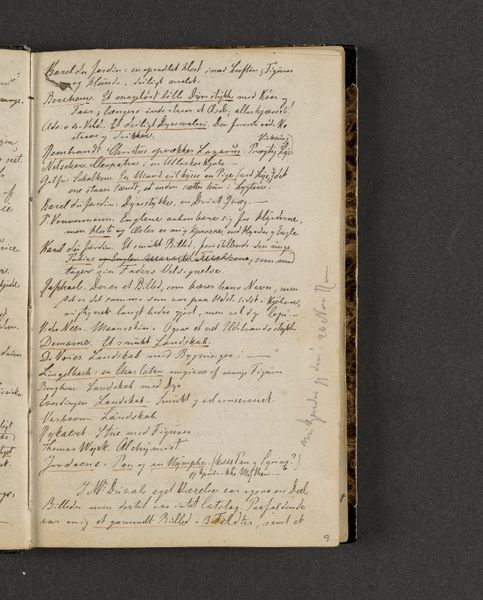 Editor: So, this is Johan Thomas Lundbye's "Vers. Side 9," from around 1840 to 1844. It’s ink on paper, a page from a sketchbook, it looks like. The script gives it an intimate feel, almost like reading someone's personal journal. What stands out to you? Curator: Indeed, this script *is* intimate, evoking personal memory, and Lundbye's Romantic sensibility draws heavily on folk traditions and a reverence for the land. The calligraphy itself isn't just text, it's an echo of illuminated manuscripts and a longing for a lost connection with nature, wouldn't you agree? The meticulous details are visual representations of those values. The tight, rhythmic lines act as symbols of constrained feelings. What feelings rise up for you when observing the image? Editor: I can see that... It does have a slightly melancholic air. Like he's yearning for something just out of reach. Is the floral motif symbolic here? Curator: Absolutely! In Romanticism, the symbol of the flower transcends mere aesthetic pleasure, blooming into symbols of ephemeral beauty, reflecting our fleeting existence. Doesn't this contrast vividly with the enduring quality of the written word surrounding it? This duality infuses the image with a sense of transient beauty against permanence. Editor: I see! It's like the writing is an attempt to capture something beautiful that will inevitably fade. I had not considered this aspect. Curator: Precisely! Romantic artists like Lundbye are preserving cultural memory. They remind us of a need to reflect on human and cultural endurance over time. It’s about continuity through shared visual languages. Editor: So interesting! Now I feel as if I've truly deepened my insight into Romantic art and cultural symbols, something I can apply in other works I am observing. Thank you for all your insights.