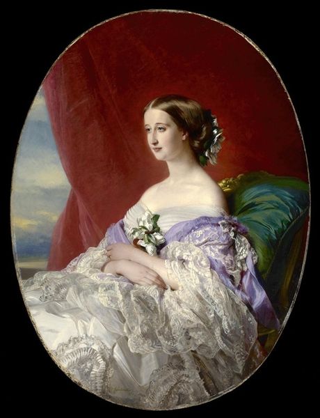 Curator: Franz Xaver Winterhalter, a renowned portraitist of 19th-century European royalty, painted this striking “Portrait of a Lady,” around that time. It exemplifies academic art and a fancy-picture theme so it should provide us with a chance to look at the social construction of femininity. Editor: The muted palette immediately creates a somber mood, despite the elaborate gown. The artist really captured the textures of the silk; observe how the light plays on those subtle folds. There’s a kind of structured elegance to it that is very precise. Curator: It's more than just fabric, isn't it? It’s a manifestation of social standing and power, that garment speaks volumes about the sitter’s position, her constraints, and expectations. That subtle red lining of the wrap adds an undertone that hints at her inner desires and sexuality within a highly structured society. It's really romantic. Editor: I see what you’re getting at. Looking more closely at the application of oil paint I find those contrasts work subtly on a level that escapes an immediate conclusion; however, the romanticism present relies on fairly stock pictorial constructs such as those dark backgrounds to isolate the subjects in a contemplative setting. The white dress in the middle contrasts perfectly. Curator: Consider her pose. A slight turn of the head, her gaze engaging yet reserved –it presents the negotiation between societal expectations of a lady. Her very controlled placement communicates so much about the role of women in the 19th century! Editor: Yes, her face shows a placid serenity achieved with precise brushwork. However, from my view the semiotics are fairly evident as well and the image plays out its coded and easily understood arrangement. The work strikes me as something primarily illustrative and technically efficient in nature. Curator: Perhaps. But what I appreciate is the layering – Winterhalter manages to simultaneously portray outward composure with suggestions of individual complexities in this historical context. It becomes a kind of cultural text open to interpretation. Editor: For me, stripping away the layers simply reveals proficient handling of color and form. Though perhaps lacking in a subversive quality, the way in which it creates its composition is interesting. It has been great to appreciate the contrast of historical contexts here as we have finished.