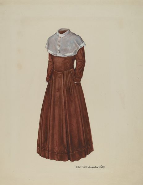 Curator: Mina Greene created this lovely piece, titled "Woman's Coat," circa 1938, using graphite and pencil. It's deceptively simple at first glance. Editor: It reminds me of…a gothic novel. All hushed hallways and secrets whispered in the dark. Stark, almost…eerie in its emptiness, no? It's like the coat is a stand-in for a person. Curator: Absolutely. The emptiness amplifies the social implications. Garments are never just fabric. Clothing acts as a signifier, announcing gender, class, and sometimes even conformity or resistance to prevailing social norms. The coat almost dares us to fill it with our own narratives, to ask who would have worn this and where? Editor: I keep wanting to know who wore it and the shadow quality reminds me of waiting in the dark. Was it elegant or restrictive? A symbol of status, sure, but at what cost? There's an implied presence that hangs heavy. A life, muffled somehow. I feel like she isn’t gone so much as… suspended. Curator: And we can consider the limitations of the artistic gaze. A static, singular coat rather than a dynamic figure—is this simply observation, or does it hint at a deliberate silencing? Mina Greene, by focusing on absence, invites us to interrogate power dynamics embedded in fashion. How garments reflect, and at times, conceal, the complexities of a woman’s identity within a certain time. Editor: A silencing! I like that, almost like a phantom of fashion. Perhaps the missing person is the main subject of the painting? A statement of power, maybe; a rebellion frozen in charcoal. What's left behind once a life moves forward. Curator: Well said, it provokes fascinating layers of analysis, doesn't it? The intersectionality between fashion, identity, and historical power dynamics, laid bare—or perhaps laid… empty. Editor: Emptiness has weight, doesn't it? It lets your own imaginings become the art. I feel like I'm now a co-creator! Thanks, Mina Greene!