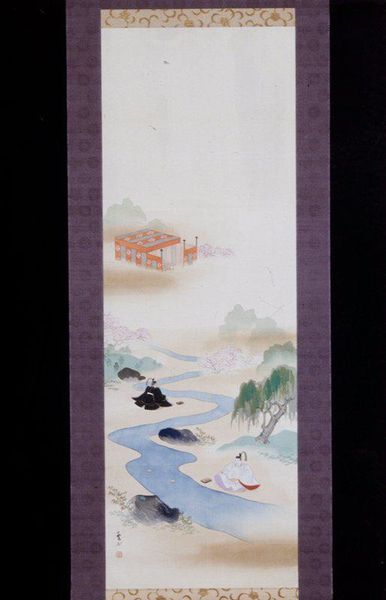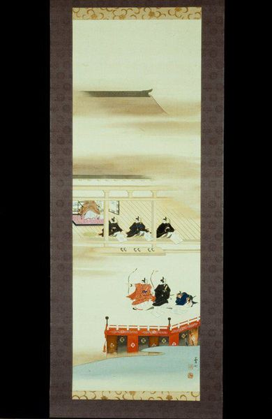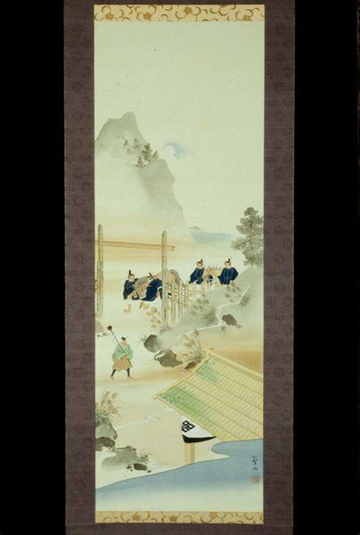 Curator: This artwork, currently residing at the Minneapolis Institute of Art, is titled "June (Gion-Matsuri or Gion Festival in Kyoto)". It’s a watercolor painting by Suzuki Toshimoto, dating from around 1910. Editor: It has such an airy, dreamlike quality! The muted colors create this feeling of gentle observation, almost as if we’re peering through a veil at a moment in time. And that procession… it's both regal and quaint. Curator: Yes, its dreaminess aligns with the ukiyo-e tradition of capturing fleeting moments of everyday life, albeit in a refined, aestheticized manner. The Gion Festival itself holds deep historical and social significance within Kyoto’s cultural fabric. Editor: Those little figures, they're riding horses under an umbrella. Makes me wonder what’s happening? What’s being celebrated? I imagine sounds: the clip-clop of hooves, the murmuring of voices, distant music. Is that a full moon in the background, or just pale clouds? Curator: That hazy luminescence adds another layer to it all, doesn't it? As a genre painting, it offers a glimpse into the ritualistic performances that underpin Kyoto's identity, while the artist’s choice of watercolor adds a softness, perhaps commenting on the ephemerality of cultural practices even as they are meticulously upheld. Consider also that festivals reinforce existing social structures but can simultaneously provide a space for transgression. Editor: Transgression at a festival—interesting. It also feels so balanced despite the lack of symmetry. There’s this lightness about it... like a whisper. Even though the festival is public, there’s an element of hidden emotion, an interiority. Curator: The composition encourages our eyes to travel from the bottom landscape to the riders at the top. This vertical emphasis subtly mirrors hierarchical structures that might be intrinsic to understanding the festival itself, suggesting a deeper analysis of power dynamics at play during this seemingly festive event. Editor: Power dynamics at a festival in a dreamy landscape! Who would've thought? I guess the best art lets you see more each time you look. Curator: Exactly, I hope it also motivates you to see the past in conversation with the present.