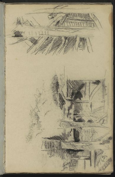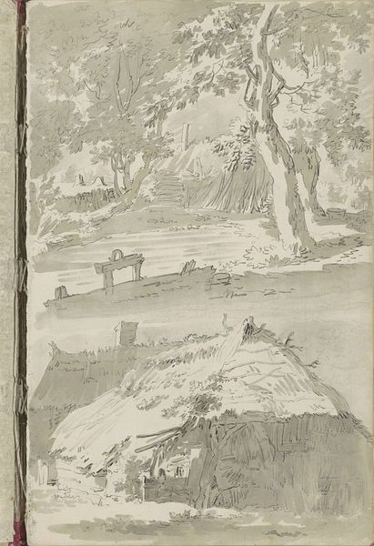 Editor: So, this is "Landschap met een kind bij een huis aan een pad en een landschap met figuren op een pad" by Maria Vos, sketched sometime between 1834 and 1906. It's a pencil drawing, currently residing here at the Rijksmuseum. I'm really drawn to the, uh, fleeting quality of it, the way the images seem to almost dissolve on the page. What catches your eye? Curator: Fleeting is the perfect word. It feels like we're peering into a dream, doesn't it? Vos has captured something so ephemeral. What I find striking is the layering of these two distinct scenes, one above the other. Almost as if they're separate memories sharing the same space. Tell me, what does the child by the house evoke for you? Does it feel solitary or peaceful? Editor: I think solitary, but not necessarily in a sad way? More like a moment of quiet observation. It’s like glimpsing a scene from a half-remembered fairy tale, almost dreamlike as you say. It's interesting how the looseness of the pencil work contributes to that. Curator: Absolutely! It invites us to fill in the blanks, to project our own narratives onto the scene. Pencil, at its best, is so intimate – like a direct line to the artist's thoughts. I wonder what she was pondering while creating these landscapes? What stories was she hoping we would create to go along with them. Editor: It definitely feels like an invitation. It makes you consider art’s capability to show only part of a tale, so you add your interpretation. It definitely allows you to glimpse her mind while encouraging me to use my own perspective. Curator: Yes, I love the invitation to explore. And you know what I just thought, sometimes the most potent art is the stuff that requires us to fill in the blanks ourselves. Editor: Agreed. It’s made me see the value in what’s implied, not just what’s shown. Thanks for chatting!