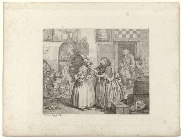 Editor: This is Nicolas Toussaint Charlet's "Eggs' Saler with a Drunk Man." It seems to capture a chaotic street scene. What formal elements stand out to you? Curator: The stark contrasts in value immediately command attention. Note how Charlet employs hatching and cross-hatching to create depth and shadow. How does this affect the overall composition? Editor: It almost feels like a stage, with the figures thrust forward. Do you think this was intentional? Curator: Indeed. Observe the density of the lines surrounding the figures, drawing our eyes to the central interaction. The varying textures created by the ink—rough and smooth—also contribute to the work’s dynamism. Editor: I hadn't noticed how the varying textures added to the dynamism. Thanks for pointing that out. Curator: A close analysis of form reveals so much.