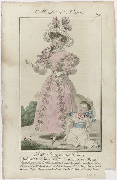 This fashion plate, made by Auguste Delvaux in 1831, showcases clothing of the era. The printmaking process itself deserves attention. It's an engraving, meaning the image was incised into a metal plate, inked, and then pressed onto paper, allowing for mass production and distribution of style trends. The depicted garments, made from materials like blond lace and organdy, exemplify the period’s emphasis on elaborate detailing and fine fabrics. The puffed sleeves and embellished bonnet signal the amount of labor and resources poured into creating fashionable attire. Such garments were not just about aesthetics; they reflected social status and the dynamics of the textile industry. The layers of lace and trimmings involved a multitude of skilled workers, from spinners and weavers to seamstresses. The print serves as a reminder of the complex social and economic networks underlying even the most seemingly frivolous aspects of material culture.