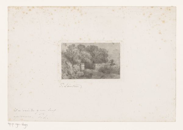 Editor: So, here we have “Landschap met meanderende beek”, or “Landscape with a Meandering Brook,” created sometime between 1860 and 1910. It's at the Rijksmuseum and attributed to Alfred Elsen. What strikes me most is the intimacy of it, almost like peering into a secret world. What do you see in this piece? Curator: It’s funny you say “secret world”, because for me, this print evokes the fleeting quality of memory itself. That wash of delicate greys feels like looking back at a place half-forgotten, a dreamscape clinging to the edges of awareness. Notice how the meandering brook isn’t just a physical feature; it mirrors the wandering path of recollection. It leads the eye—and the mind—into the heart of the landscape, just as our thoughts delve deeper into the past. Doesn't the texture almost feel as though the landscape could fade away entirely? Editor: Absolutely. It's so ephemeral. The trees feel more like suggestions of trees. It's interesting you mention memory. Did the artist intend it to be viewed as such? Curator: Perhaps not intentionally, though art rarely declares its entire purpose upfront! Consider that during this period, many artists were drawn to capturing fleeting moments and impressions of nature. There's a definite connection with the concept of Romanticism in this era of capturing pure essence! Now, what does the actual composition and almost minimalist view tell you? Editor: The minimalism enhances the feeling of nostalgia, right? Because it's not weighed down with detail; it's just the essentials, the feeling of a place. It's all sort of implied in a simple memory. I see how the Romantic undertones play in as well with the nostalgia. Curator: Exactly. It invites us to fill in the blanks with our own memories, our own longing for a past, real or imagined. Editor: I never considered art as an echo of dreams. That's something new to keep in mind while analysing art. Curator: And maybe, just maybe, it will reshape the way you analyse not only art, but the entire world.