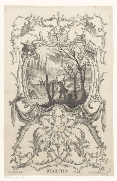 Curator: This engraving, entitled "Ontwerp voor een lambrisering met een vrouw op een schommel," which translates to "Design for a paneling with a woman on a swing," was created between 1705 and 1772. It's currently held in the collection of the Rijksmuseum. Editor: It's delightfully frivolous! The eye is immediately drawn to the woman on the swing, caught in a moment of mid-air flirtation. The delicate linework really captures the airy, carefree spirit. Curator: Absolutely. Looking at it through a materialist lens, we see this isn’t simply an image, but a designed object intended for mass reproduction. As a print, it represents a desire to decorate the homes of the rising merchant class and participate in that culture of display. Editor: True, but let's not overlook how masterfully Huquier uses line and form to create depth and movement within the frame. Observe the cascading foliage; the eye is subtly directed towards the figures. The swirling border mimics the swinging motion. Curator: I see what you mean, but it's essential to also think about the labor involved in the production of prints, from the initial design by Huquier to the work of the artisans reproducing his designs for wide distribution. Were these workers part of workshops with connections to the art market, or where they part of independent contractors laboring within a domestic context? Editor: These questions bring context but the image speaks for itself, reflecting Rococo sensibilities. There's a clear celebration of elegance and pleasure within the composition. It embodies the stylistic conventions of the era. The romantic scene framed with ornate embellishments! Curator: Precisely! By examining such an image, we reveal much about eighteenth-century French social values, the culture of consumerism, and the complex web of social relationships that fueled the production and consumption of luxury goods. It allows to think not only about design as form but how that form comes to be a signifier through the modes of its production and dissemination. Editor: A wonderful, very productive observation, and a way to round out this consideration of the panel print from Rijksmuseum! Curator: Thank you. It provides a lens through which to view its materiality and cultural legacy.