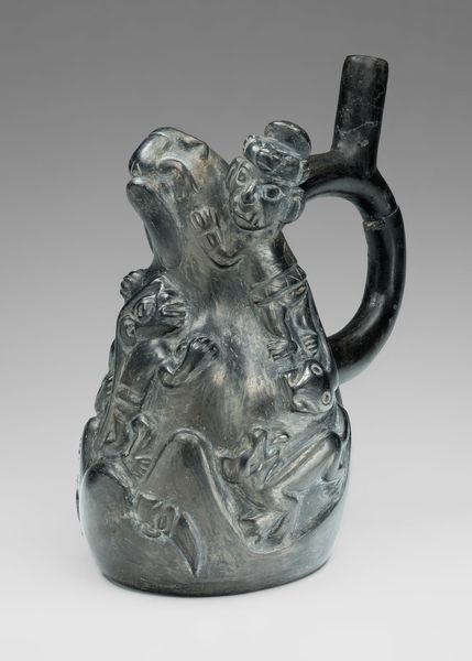 Editor: This is an earthenware pitcher from sometime between 1830 and 1860. What really strikes me is the almost chocolatey glaze and the raised relief decorations. What do you see in this piece? Curator: Immediately, I'm drawn to how this seemingly simple utilitarian object becomes a powerful vehicle for constructing and disseminating a particular narrative. This pitcher, likely made for the burgeoning middle class, elevates George Washington, visually associating him with nation-building through imagery related to stonemasonry. Editor: So it's not just a decorative piece? Curator: Exactly. Think about how history is memorialized and mythologized through objects like this. Who is included, who is excluded? Consider, for instance, the absence of enslaved people whose labor underpinned Washington's wealth and the very foundations of the nation. The relief tells a sanitized version of the American story. Editor: I see what you mean. It's interesting to think about the stories that everyday objects can tell. Curator: Yes, and who gets to tell them and from what perspective? Also note that objects such as this were also distributed internationally, serving as cultural ambassadors of sorts and often presenting very selective, sometimes distorted, pictures of life in the United States. Editor: It reframes how I see even seemingly benign objects. Curator: Indeed, objects often tell multiple stories – ones of power, privilege, and the constant negotiation of cultural identity. We learn about aesthetics but need to remember power structures as well. Editor: I never thought a pitcher could be so… complex! Thanks for showing me this context. Curator: Absolutely! Engaging with art through a critical lens helps us understand its role in shaping societal narratives.