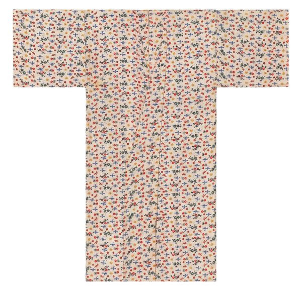 The aristocracy used cotton for winter garments. The cut of this garment is typical for Ryūkyūan robes (ryūso): it has sleeves completely attached to the body with triangular gussets under the arms, a long neckband, and is wider and shorter than kimonos from the Japanese mainland. Here, a complex design runs riot over it: maroon-interlocking circles of bamboo, groups of pine boughs and plum blossoms, large stylized snowflakes filled with chrysanthemums, and small ones filled with turtles and cranes, depicted in red.