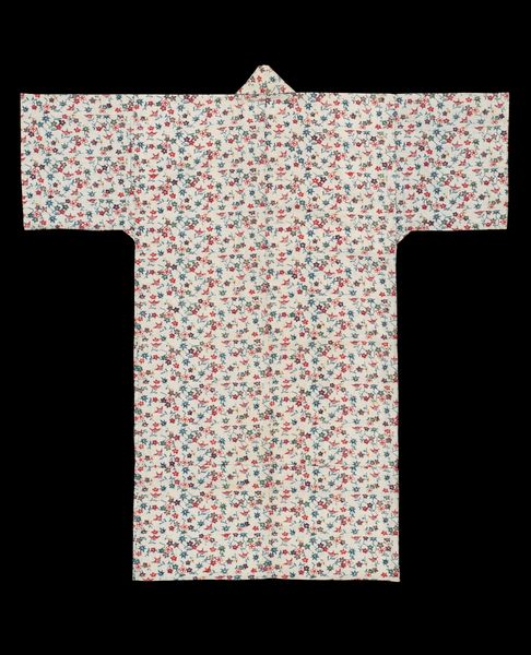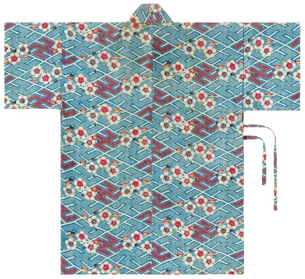 Curator: Wow, this Ryūkyūan robe is almost hypnotic. It’s light blue silk, exploding with repeating motifs. Sort of kaleidoscopic! Editor: A textile from the 19th century, most likely created in Okinawa, the design feels simultaneously ancient and remarkably contemporary, doesn't it? A gorgeous, slightly faded turquoise covers the whole thing, punctuated by rusty-red diamonds, setting the stage for floating motifs. Curator: Right? Those quirky stylized flowers mixed with the folding fans…and are those stylized snowflakes tucked in there, too? It's festive but feels so...reserved at the same time? I think of ceremonial wear that can transition into party-wear seamlessly. Editor: This points to the fascinating role textiles like this Ryūkyūan robe played in shaping social and political identities. Imagine the layers of cultural exchange folded into this single garment! The trade networks between Okinawa, Japan, and China...it spoke volumes without uttering a word. Curator: That’s a beautiful thought. The robe *as* language. What sort of stories would this particular robe whisper, do you think? Its materiality seems crucial. The slubby silk catches light in an otherworldly way. I keep thinking I detect traces of someone in this material. Editor: Given that such robes were originally diplomatic gifts, could this “someone” have been worn at a formal occasion within a Japanese delegation meeting, or during a crucial negotiation? Each design element here underscores not just Okinawan identity, but its careful performance on the world stage. These garments, worn by elite members of Ryukyu Kingdom, were integral to Ryukyu’s diplomacy! Curator: It becomes more complex with every layer! Almost like those embedded designs...It speaks of heritage and status, yet simultaneously conveys grace. It dances in a lovely, enigmatic harmony! Editor: Indeed, it challenges Western assumptions of art as simply "visual", inviting us to consider its active social agency. It’s a pattern book about diplomacy. Curator: Precisely! And its ability to be profoundly evocative on a personal level – whispers and histories combined! Editor: I concur wholeheartedly—the Light Blue-Ground Ryūkyūan robe represents a potent chapter in art history that continues to speak volumes.
