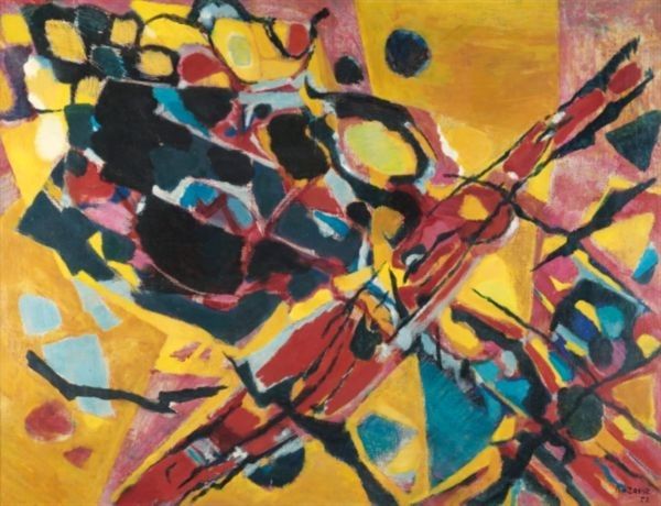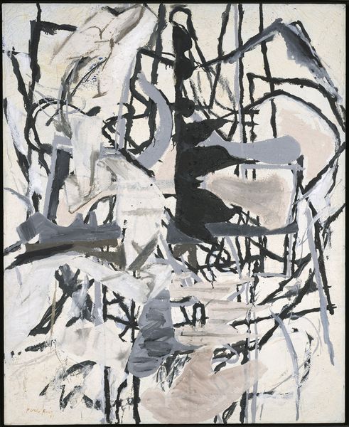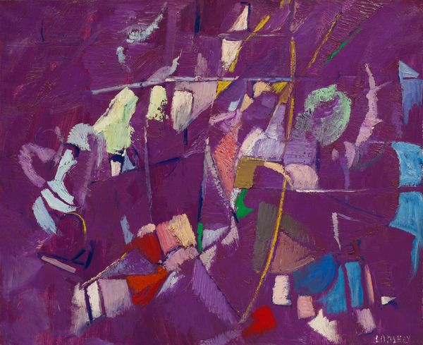 Andre Lanskoy made this painting, "Composition sur fond ardoise" with oil paint, applied with brushes of different sizes. The title translates to "Composition on a Slate Background" which immediately draws our attention to the materials and their influence on the work. Oil paint allows for layering, blending, and a range of textures, from smooth gradients to thick impasto. The foundation of the painting imitates the rough, matte texture of slate, setting a somber, industrial tone. Lanskoy applied vibrant colors—reds, whites, and oranges—in a bold and energetic manner, contrasting with the muted background. The painting suggests a tension between control and spontaneity, planning and chance. The labor involved is evident in each brushstroke, each layer carefully considered yet freely applied. Paying attention to these artistic and material choices deepens our understanding and appreciation, questioning the traditional hierarchy between art and craft.