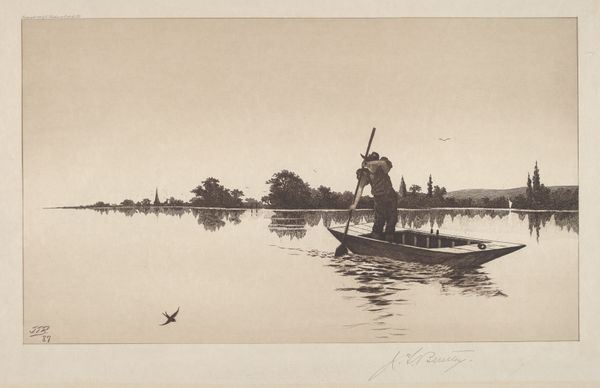 Peter Henry Emerson made this photograph, "Rowing Home the Schoof-Stuff," using a platinum printing process. This technique, popular at the time for its tonal range and permanence, involves coating paper with platinum salts, then exposing it to light through a negative. Emerson, active in the late 19th century, championed photography as a fine art. His work often depicted rural life in East Anglia, England. In this image, we see a lone figure rowing a boat laden with reeds. The quiet, contemplative scene reflects the rhythms of agricultural labor. Consider the labor involved, not just in the subject of the photograph – harvesting and transporting reeds – but also in the making of the image itself. Each print required careful preparation and skilled execution. By highlighting these processes, Emerson elevated photography beyond mere documentation, imbuing it with artistic and social significance. His focus on the working class challenged the established art world.