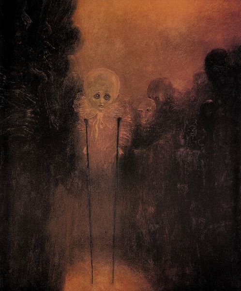 Editor: Zdzislaw Beksinski’s Untitled painting from 1975 presents this nightmarish, imposing figure rendered in oils. There’s such a heavy, unsettling atmosphere, especially with all those grasping hands. What do you see in this piece, in terms of its historical and cultural relevance? Curator: This work reflects the sociopolitical anxiety prevalent in 1970s Eastern Europe, particularly in Poland where Beksinski lived. Notice the decaying, almost skeletal forms; they speak to a fear of societal collapse and the dehumanizing effects of oppressive regimes. Editor: The figure definitely has a feeling of being weighed down, oppressed somehow. Is there a connection to the art world at that time, in terms of artistic movements or reactions? Curator: Beksinski is often associated with neo-expressionism, a movement reacting against the coldness of conceptual art by embracing intense personal emotions and figuration. But the explicitly bleak imagery here—the deformed body, the desolate landscape hinted at in the pendant—also represents a cultural reckoning with trauma, exploring themes that were often suppressed under authoritarian rule. Does the painting seem to hold public or private sentiments? Editor: Both, I think! The individual form feels incredibly personal in its grotesque detail, yet the multiplication of hands implies a widespread feeling. How interesting to view it through the lens of historical pressures and public expression. Curator: Exactly! This is an example of how art could communicate dissenting ideas through symbolic imagery, even within restrictive political landscapes. Editor: I see now how the work operated within specific constraints of expression, a potent reminder of art's role in sociopolitical contexts. Curator: Indeed. And it invites reflection on how contemporary sociopolitical conditions are expressed through our own imagery.