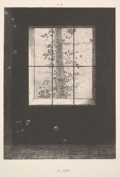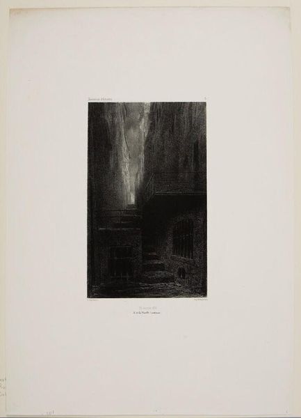 Odilon Redon created this lithograph, titled "I saw a flash of light, large and pale," using stark contrasts and textural variety to explore the depths of perception and the unseen. The composition is divided starkly; one side is lit, revealing wood-paneled walls and a tiled floor, while the other plunges into an almost impenetrable darkness, where only the vague form of a staircase can be discerned. This stark juxtaposition creates a visual tension, drawing you into a space that is both familiar and deeply unsettling. Redon masterfully uses lithography to create subtle tonal gradations, evoking a sense of mystery. Redon's image destabilizes conventional notions of space and perspective, reflecting broader artistic and philosophical concerns, moving beyond surface appearances to explore the realm of dreams and subconscious experience. The contrast between light and shadow challenges the idea of a stable, knowable reality. Redon invites us to consider how our perception shapes our understanding of the world, suggesting that what we see is but a fraction of what exists.