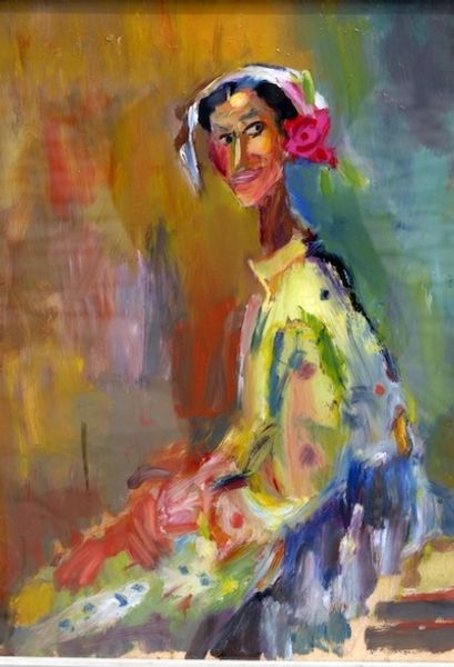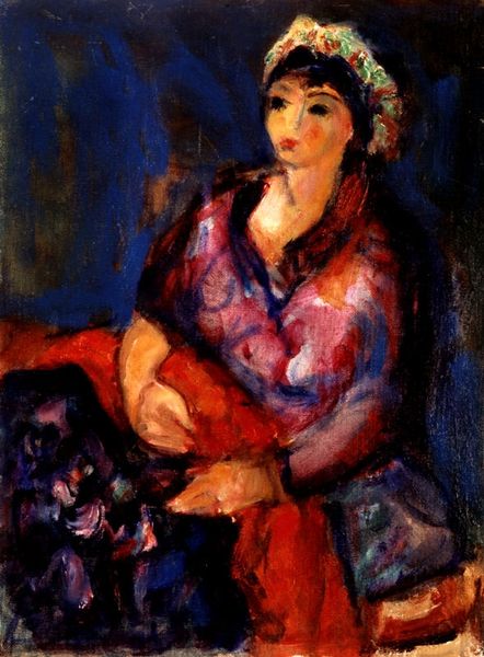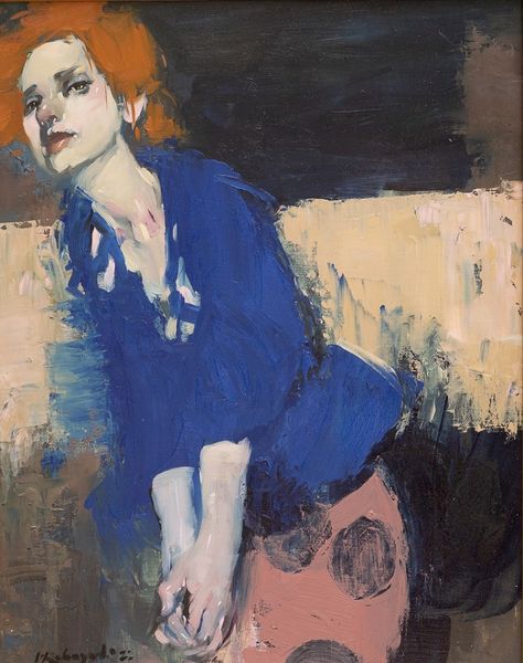 Editor: We’re looking at "Woman in Blue," painted by Alexander Bogen in 1981. It’s an oil painting with strong, visible brushstrokes. I find the color palette quite striking, yet something about her face is very haunting. How do you interpret this work, especially given its historical context? Curator: Bogen's piece sits interestingly at the tail end of modernism, when movements like abstract expressionism and neo-expressionism were hugely influential. Consider how museums and galleries in the early 1980s were beginning to canonize these styles, making statements about what 'counted' as important art. Do you see how this piece both embodies and perhaps subtly critiques the neo-expressionist trend? Editor: I can see the link, especially in the raw emotion conveyed and the somewhat distorted figure. But is the figure itself also a statement? Is the way that woman is presented supposed to represent anything, or critique something in terms of female portrayal? Curator: Absolutely. The depiction of the female form is never neutral, particularly when situated within art history. Nudity, even obscured as it is here, always carries a loaded history of power, objectification, and social expectations. Ask yourself: what political implications might arise from this work within 1980's social discourse? Editor: That’s fascinating. So, while on the surface, it might seem like a simple portrait, it’s actually engaging with much broader social and historical issues around art and representation? Curator: Precisely. Bogen uses the visual language of expressionism, which, by that time, was becoming institutionalized, to engage in dialogues concerning female identity and the art world. Editor: I will definitely keep that in mind while studying art history. Thank you. Curator: My pleasure! Reflecting upon these connections really deepens one's understanding.
