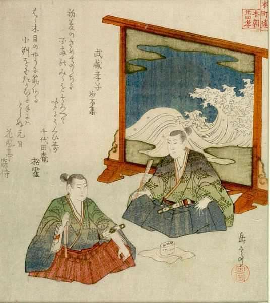 Curator: The Harvard Art Museums hold this print by Yashima Gakutei, titled "Courtesan Suehiro of the Ågiya with Attendants and New Year's Gifts." Editor: It strikes me immediately with its delicate, almost pastel palette, and the rhythmic repetition of fan motifs throughout the composition. Curator: This print is part of a series called "Views of the NakanochÅ for the Hisakata Poetry Club." Gakutei created it to be paired with poems by Seikaitei Kamehito and Sawanoya. It reflects the culture of artistic patronage during this era. Editor: The lines are so precise, and the flat planes of color create a sense of depth without traditional shading. The artist's attention to pattern and detail is remarkable. Curator: Indeed. These gift-giving scenes were often commissioned by courtesans to maintain their social standing. It speaks volumes about the socio-economic realities of the time. Editor: A beautiful demonstration of how formal elements and artistic intent can create a rich visual experience.