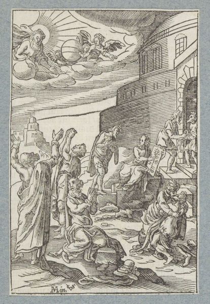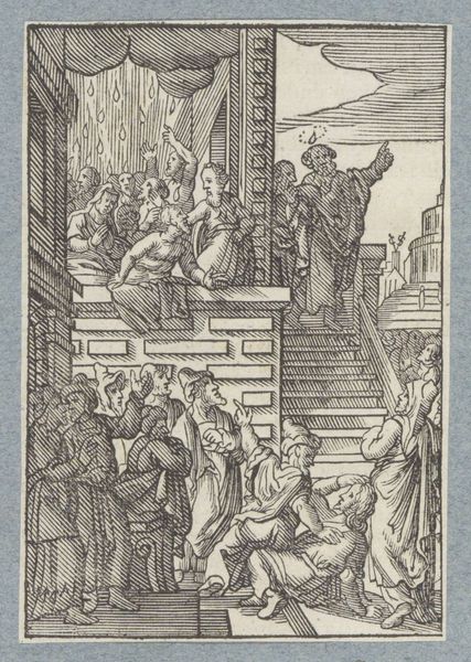 Curator: Here at the Rijksmuseum, we have before us, "Joseph's Brothers Kneeling Before Him in Egypt," created by Christoffel van Sichem II, sometime between 1645 and 1646. It's an engraving, a print, really packed with figures. Editor: It's... dense. The composition feels incredibly compressed, doesn't it? All those figures pushing forward, the rigid architecture behind. The emotion seems almost… suffocating. Curator: Baroque printmaking often served didactic purposes. These images, disseminated widely, reinforced biblical narratives within the socio-political framework of the time. Van Sichem’s rendering brings Joseph’s story to a broader audience. Editor: The stark contrasts emphasize the drama—almost theatrical. See how the kneeling figures in the foreground are brightly lit while the city behind appears as an ominous backdrop. And those receding columns; such rigid verticals establishing the scene. Curator: It invites reflection on power dynamics, familial reconciliation, and, arguably, colonial administration—given that Joseph holds a position of power in a foreign land. The checkerboard floor becomes significant in this discussion, highlighting concepts of order. Editor: Right, the composition echoes other formal artistic elements of its period like paintings on biblical stories, such as similar use of chiaroscuro, a technique which exaggerates the dramatic effects. Even though there are other individuals around Joseph, he still is rendered with his own illuminated space which emphasizes his superiority. Curator: Consider also that the Baroque period favored this kind of intense emotionalism to move the faithful. This print, by disseminating the image so widely, contributed to that end, reminding the everyday believer of God’s promise and mercy through this domestic retelling of the events. Editor: Overall, it's clear the artist wants to tell you something, right here, right now. There is such narrative clarity in all the linear detailing of people’s emotions! Curator: Precisely. It reveals much about how religious and moral narratives were visualized and disseminated in the 17th century, through what, to our eyes, looks incredibly modern! Editor: Ultimately it displays the effectiveness of design to support the storytelling behind visuality.