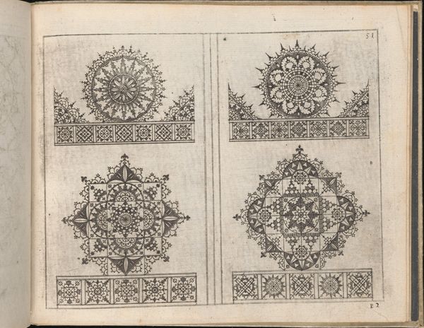 Curator: This detailed engraving is a page from Johann Sibmacher's "Newes Modelbuch in Kupffer," printed in 1604. The work is currently housed at the Metropolitan Museum of Art. Editor: It's astonishingly intricate! So many geometric shapes and repeating motifs crammed onto one page. Almost dizzying, like staring into a kaleidoscope. Curator: Absolutely. These model books served as guides, or pattern books, for artisans – think embroiderers, lacemakers, and other needleworkers – providing a repertoire of designs to draw from. It demonstrates the increasing availability of art and design ideas at the time. Editor: So, a kind of proto-Pinterest for 17th-century craftspeople? I notice the symbolic language at play – these aren't merely decorative designs. Take that crowned heart, for instance – undoubtedly resonant with ideas of love, devotion, perhaps even religious fealty. Curator: Indeed, the symbols often carried complex social and religious meanings. These weren't just pretty patterns; they communicated status, allegiance, and moral values, depending on how and where they were employed. The very act of recreating these patterns was itself an expression of cultural belonging. Editor: The act of dissemination of art itself through the prints… Fascinating how a single page embodies so many facets of Renaissance life. It reminds us that even seemingly simple visual elements were charged with deeper significance. Curator: A vital insight, wouldn't you agree? Next time, try to think of craft objects in terms of wider historical issues and cultural ideals, to better appreciate a broader political view about it!