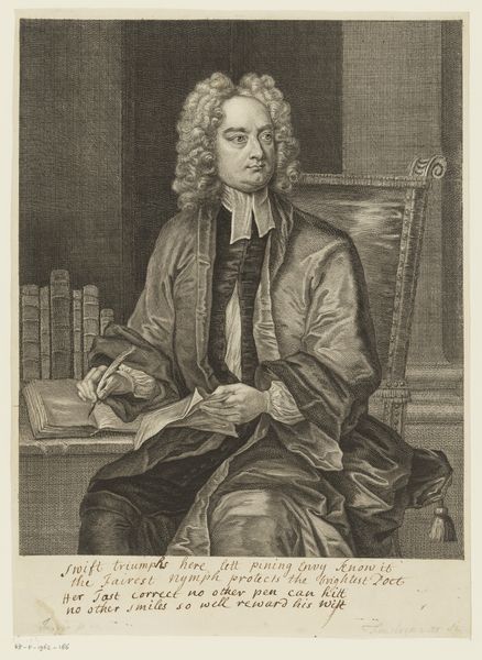 Curator: Right, let’s take a look at this engraving. It’s called “Portret van Hugo van der Helst” and it’s attributed to Nicolaas Verkolje. The piece likely dates from somewhere between 1683 and 1746. What are your first thoughts? Editor: Somber. Intellectual, certainly. Almost... sepia-toned even though it's black and white. It feels heavy with knowledge and perhaps a touch melancholic? Like I should be listening to harpsichord music. Curator: You picked up on the historical mood precisely! This print really exemplifies baroque portraiture, don't you think? The subject is surrounded by scholarly accoutrements – a towering bookcase, piles of massive tomes. One gets the impression this Hugo van der Helst was a serious man, and a very important one, too! Editor: Absolutely. I am intrigued by this contrast though. Here he is with all his signifiers of intellectual accomplishment...and yet he is also rendered via the very industrial medium of a mass-produced print! There is something about making an artwork “for the people,” a certain egalitarian tension there. Engravings brought portraiture and art into the hands of a broader audience. Curator: Good point! I mean, imagine the labor—all the intricate lines that would have had to be etched. It certainly bridges the gap between what we call fine art and skilled craft. And his expression is quite natural; not idealized. Do you find yourself wondering about the man? Editor: Definitely. All those books hint at so many late nights fueled by candle wax. He is not an anonymous figure, now. The materials and the process itself—engraving as a technology, the economics that support this—all reveal different, perhaps surprising, stories about Hugo and his time. I'll admit, though, I now want to find the book he's reading! Curator: Haha! Indeed. I think looking closely like this reminds us that even something as seemingly straightforward as a portrait can hold a multitude of layers and connections, historical, intellectual, and material. Editor: Indeed. Layers waiting to be unearthed, one finely etched line at a time!
