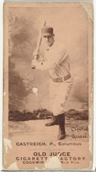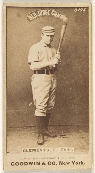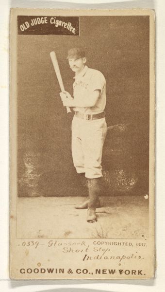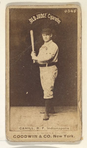 Editor: Here we have a print, actually a photograph from 1887. It’s a baseball card, part of the “Old Judge” series by Goodwin & Company, featuring Charles G. Buffington. The sepia tone gives it such an antique feel. It seems very posed and formal. What do you see in this piece, beyond the obvious baseball connection? Curator: Oh, much more than baseball! It's a portal, a glimpse into a bygone era, don't you think? The rigid posture, that handlebar mustache, the ghostly quality of the sepia... it all whispers of a different world. He's holding that bat almost like a weapon, wouldn’t you say? Or a scepter! It’s as if we've stumbled upon some royal decree about baseball! Does it remind you of anything, or maybe it makes you think of the future of AI's potential with photography? Editor: A royal decree! I love that. I hadn’t thought about the bat that way. So, this card was distributed with Old Judge Cigarettes? That’s an odd pairing! Curator: Precisely! It speaks volumes about the times. Cigarettes were, shall we say, aggressively marketed. And baseball was America's darling. It’s a brilliant collision of commerce and culture. These cards, they weren’t just promoting cigarettes; they were building dreams, weren’t they? Imagine, being a kid and collecting these cards. It's practically a time machine, wouldn't you agree? Editor: I see what you mean. So, it’s not *just* a baseball card, but also a tiny advertisement, and a social commentary. Curator: Absolutely! It’s a multilayered cake. Makes you wonder what future generations will glean from our baseball cards...or whatever takes their place. Maybe digital tokens of robotic athletes? What do you think? Editor: Robots playing baseball! Hmm, now that’s something to ponder. Thanks for shedding some light on this piece. I’ll definitely look at these cards with a different perspective now. Curator: My pleasure. Art, after all, is just a conversation starter. And hopefully a cigarette-free one in the future.