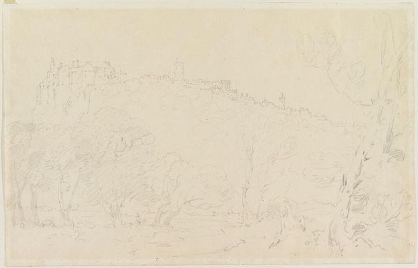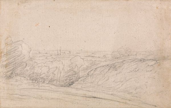 Editor: Wilhelm von Kobell’s pencil drawing, "View of Munich from Au," offers a delicate panorama. I find myself drawn to the way the city's landmarks are suggested with such minimal lines. What visual cues speak to you in this seemingly simple sketch? Curator: The spires and the faint, repeated strokes that suggest the urban landscape certainly evoke the collective memory of Munich. Consider how these repeated forms might symbolize not just the city's architecture, but also the repetition of daily life, the continuity of culture. Editor: That’s a great point! Thank you for helping me see the depth in what I initially perceived as just a simple landscape. Curator: Art is a conversation across time, and symbols are the language we use to connect.