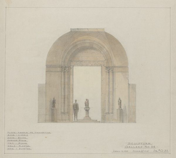 Joakim Skovgaard made this watercolor and graphite design for frescoes in Viborg Cathedral, with no specified date. It illustrates an organ arch, featuring a symmetrical structure and muted color palette dominated by grays and browns, evoking a sense of solemnity. The arch, with its rounded form, frames a central void, leading the eye upwards. The structure's mass is softened by the delicate rendering of stone textures, while decorative elements such as the angel motifs introduce a semiotic interplay between the earthly and the divine. Skovgaard’s focus on architectural form and surface texture reduces the pictorial space to its essential components. This invites reflection on how architectural designs can communicate through their form and decoration, suggesting the interplay of faith, space, and artistic expression. The artwork destabilizes established meanings by challenging the idea of surface and depth in design.