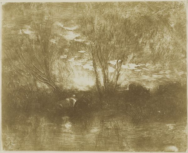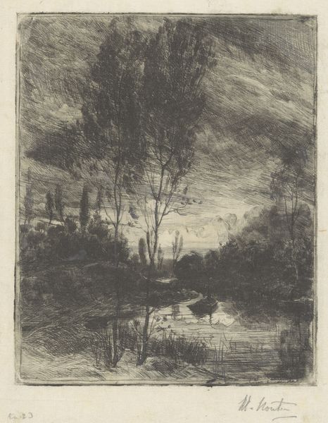 This is ‘Sloot met knotwilgen,’ or ‘Ditch with pollard willows,’ an etching made by Barbara Elisabeth van Houten. You know, the great thing about etchings is how immediate they feel. The artist is thinking, and we can see the marks of that thought so clearly! Look at the willow tree on the left bank, how it leans ever so slightly, weighed down with the sheer mass of all those scratchy, spindly branches. The surface is almost velvety, with tiny marks built up to create this atmospheric landscape. Van Houten uses this web of marks to create a sense of depth in the image, so you can really imagine yourself stepping into that scene. The soft light and dark contrasts remind me of Corot. But there’s something very personal here, too. She's not just depicting a landscape, but creating a whole world. You know, art isn't about answers, it's about exploring the questions.