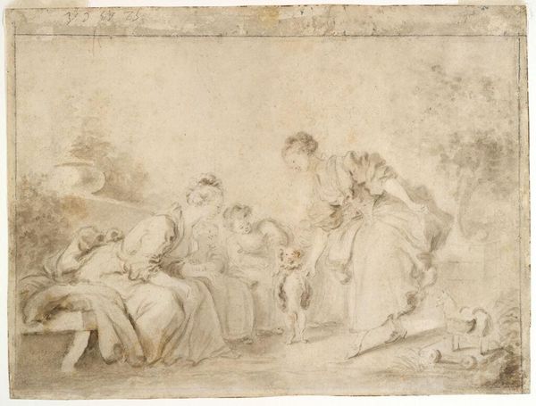 Editor: Here we have Jean-Honoré Fragonard’s drawing, "The Wager (The Burning Wig)". It's rendered in brown wash, and it gives off this very theatrical, almost chaotic vibe. What do you make of this frenetic scene? Curator: It’s Fragonard at his most playfully subversive, isn't it? The almost feverish application of wash creates a sense of immediacy and spectacle. You can almost hear the raucous laughter of the onlookers. Do you think the wig-burning is literal or metaphorical? Editor: Hmm, metaphorical perhaps? Like a symbol of foolish pride going up in smoke? Curator: Precisely! The "wager" might be less about the wig itself and more about the folly of betting on appearances. It’s a wonderfully loose, lively composition. It speaks to the artist’s keen understanding of human foibles. Editor: That makes me see the drawing in a new light. I was so focused on the action, I missed the deeper commentary. Curator: That's the beauty of art, isn't it? There's always more to discover beneath the surface.